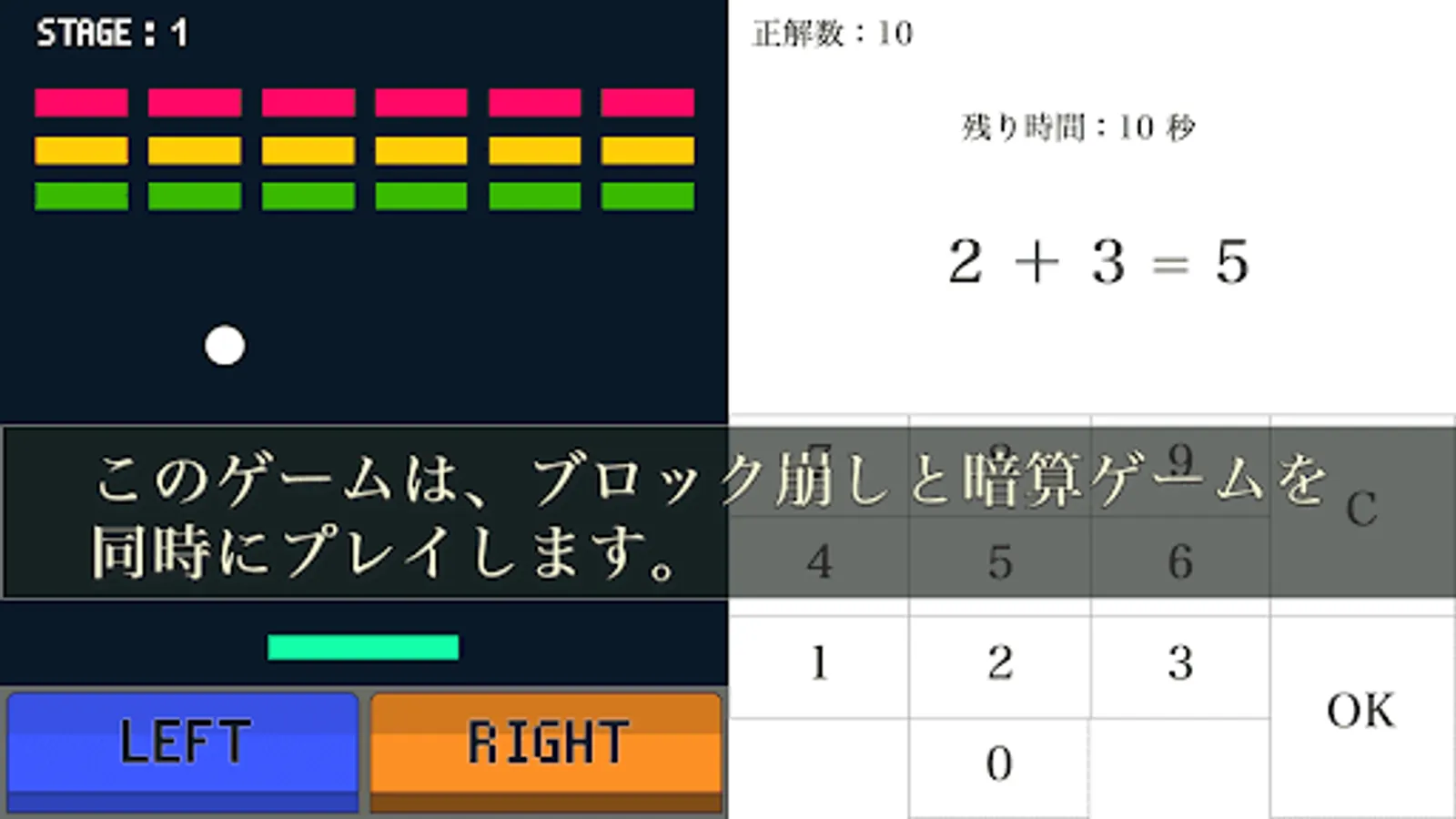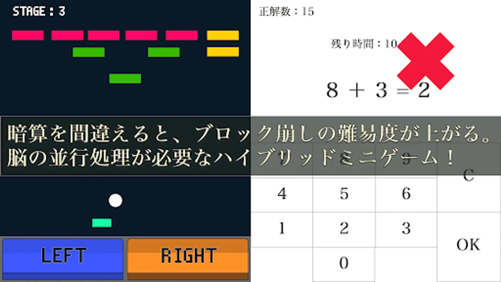 ・ Break out the block on the left side of the screen and play the mental arithmetic game on the right side of the screen at the same time.