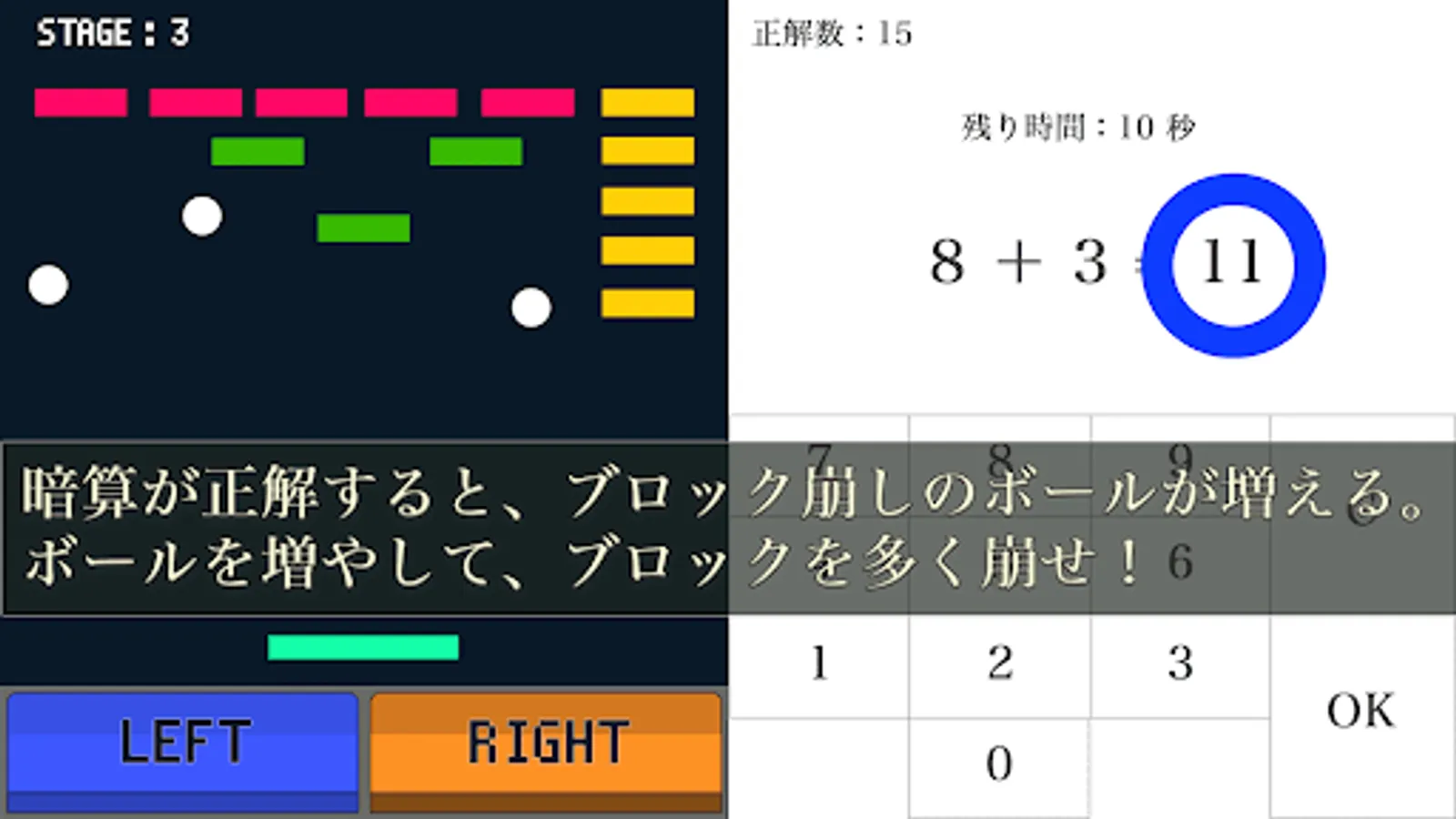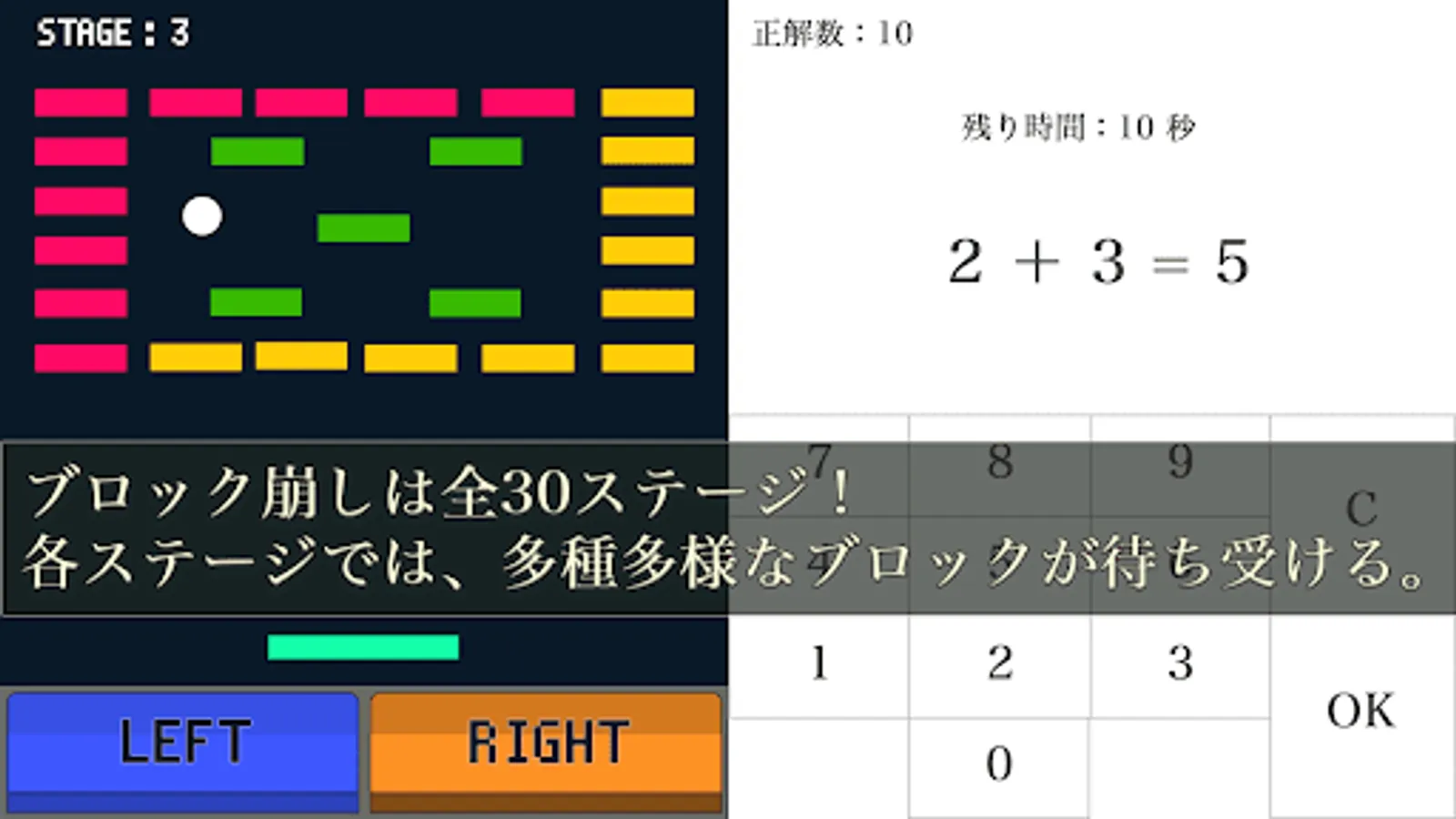 This game is a mini-game that breaks blocks on the left side of the screen and keeps solving mental arithmetic on the right side of the screen.