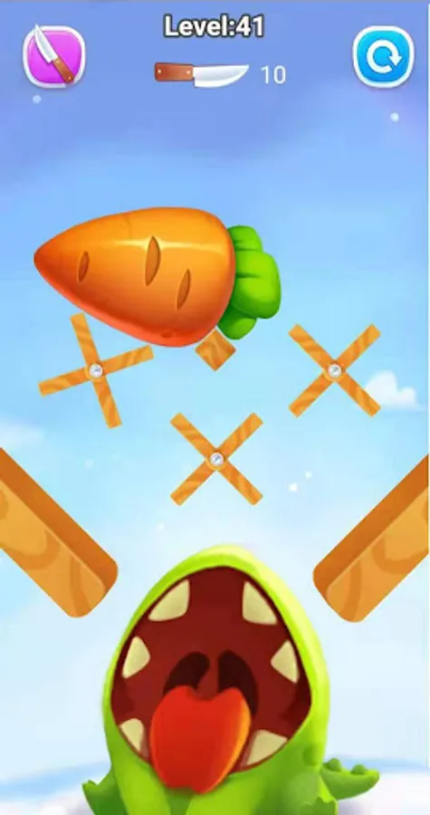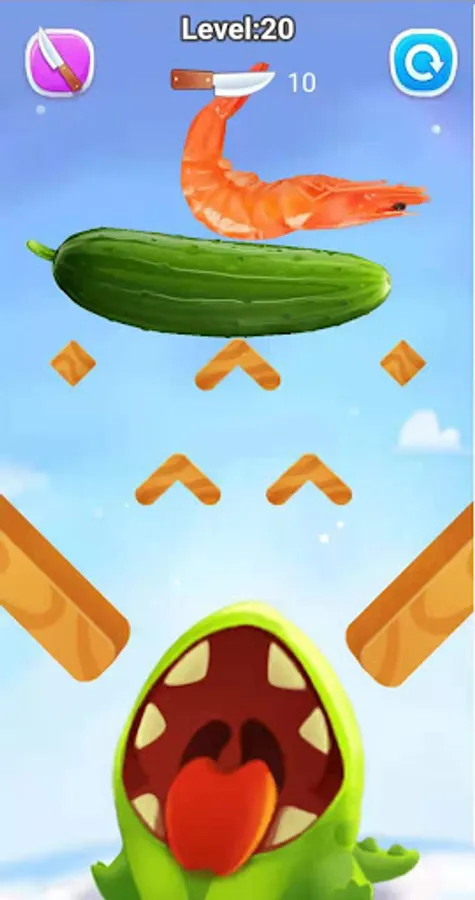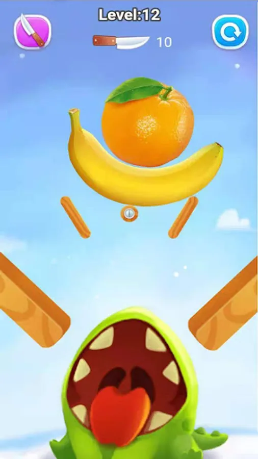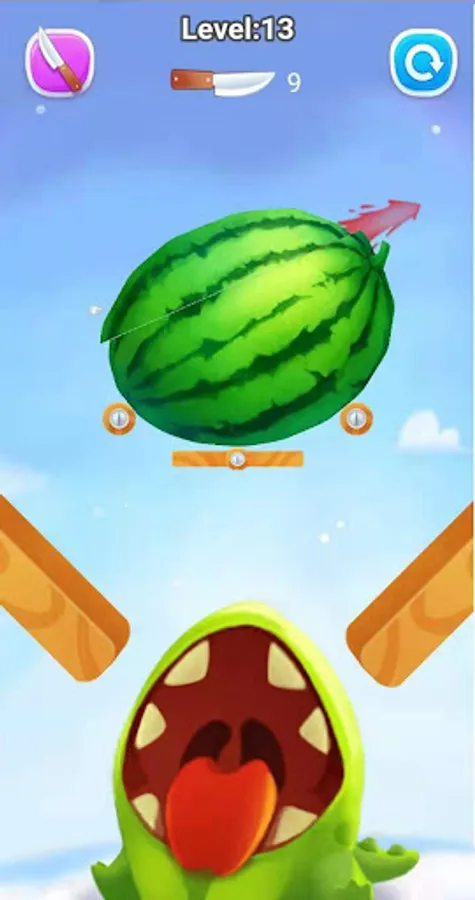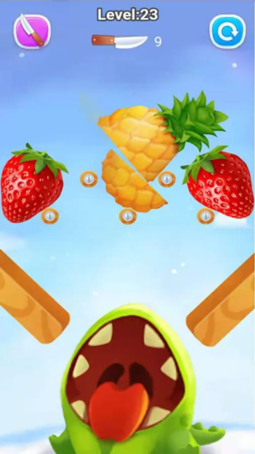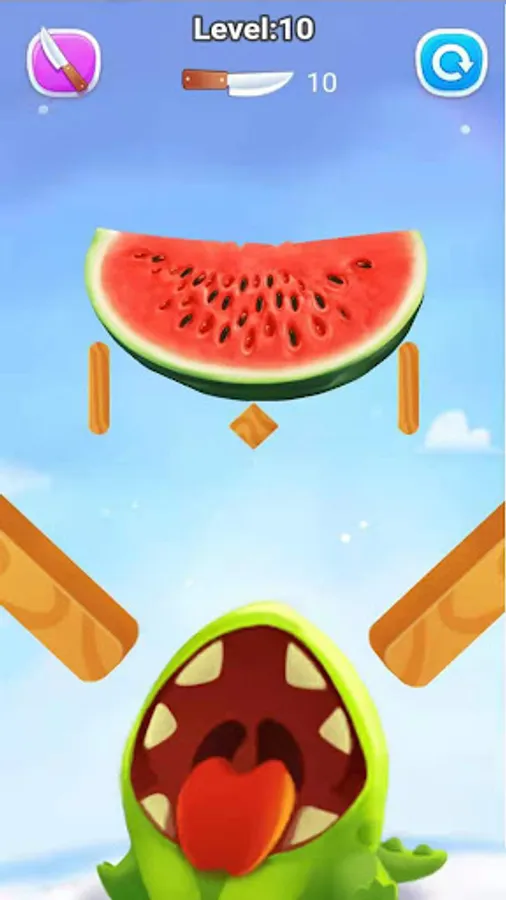 There is no time limit and you will have plenty of time to think. But there are only 10 cuts per round, so choose the most efficient cut Angle and use the fewest cuts possible to get the little monster to eat the fruit!