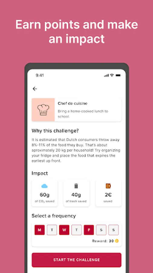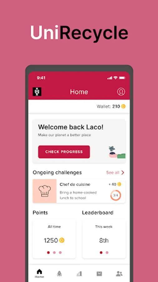 The app is designed to motivate UvA students to make sustainable choices about their waste production and overall environmental impact. It works by providing the user with challenges centered around sustainability - for example, packing lunches in reusable containers, rather than purchasing a packaged lunch. Once challenges are completed, users earn sustainability points that can be traded for rewards (discounts from our sustainable partners). Combined points also contribute to users’ place on the leaderboard, allowing users to compete with other students. The gamification-based system utilizes evidence-based intervention strategies for behavioral change, such as nudges, goal setting, and competition.