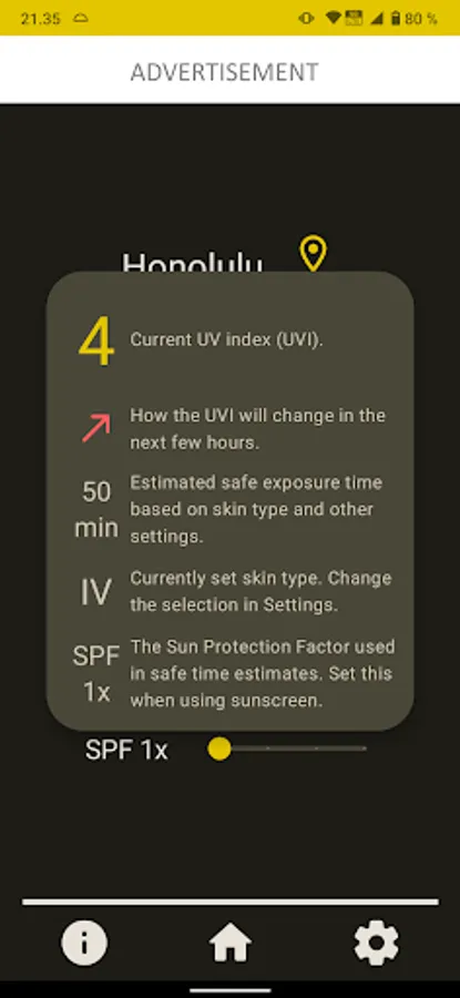 - Safe exposure time estimate based on your skin type and optional Sun Protection Factor when using sunscreen