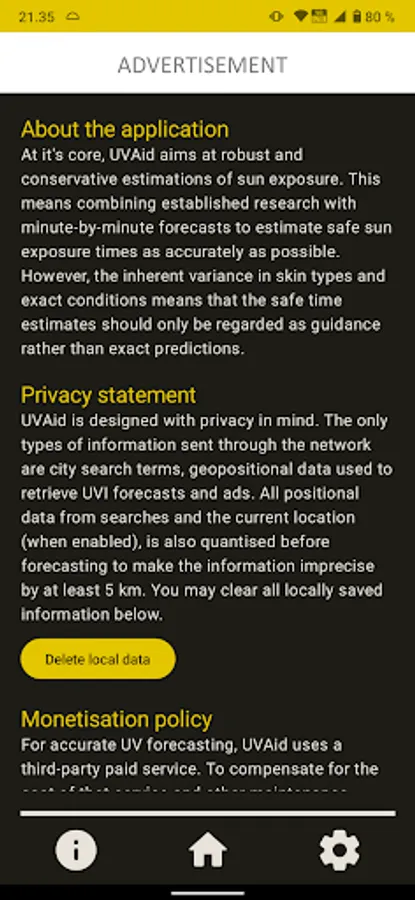 Combining research on ultraviolet (UV) radiation and advanced forecasting techniques, UVAid aims at delivering a simple-to-use and free resource on sun safety. Avoid sunburns - whether you're a sunbathing and tanning enthusiast or you just want to stay safe while spending time outdoors. Designed with privacy in mind, minimal ads.