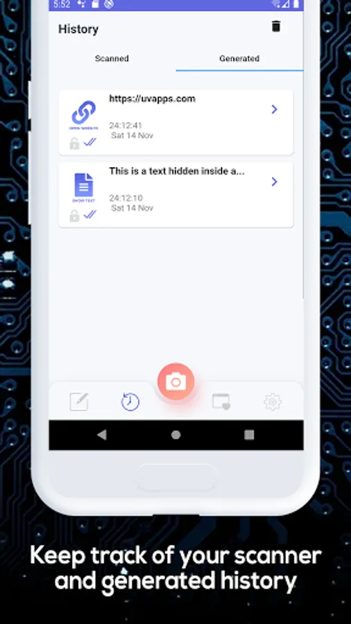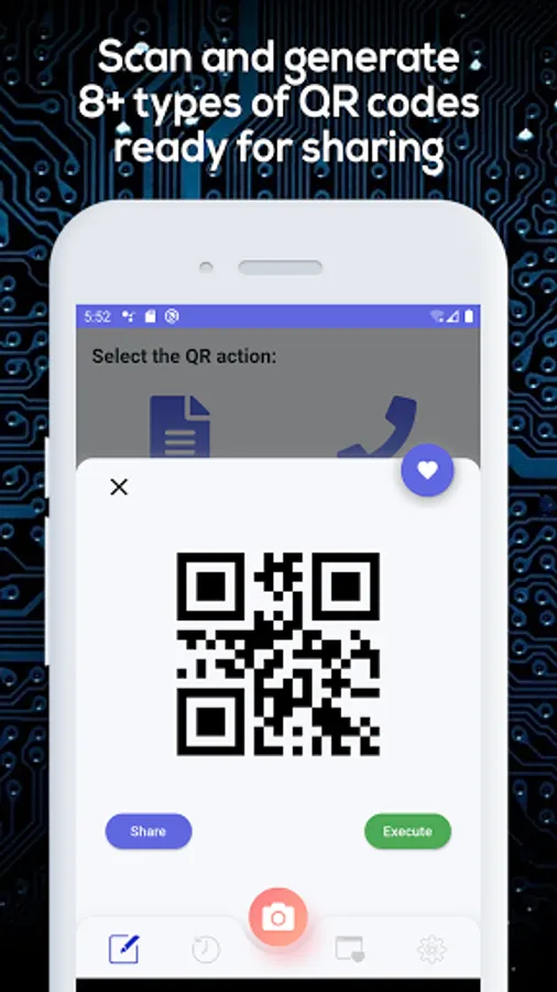 QR Eagle allows you to easily scan and generate QR codes. It also keeps a QR Codes history where you can find all the codes you have scanned, and a favorites list where you can add your highlighted QR codes for future references.