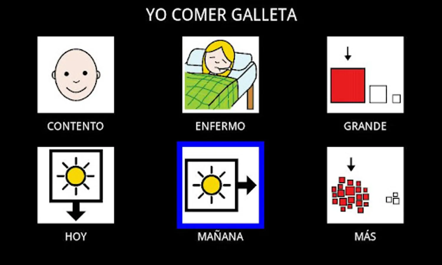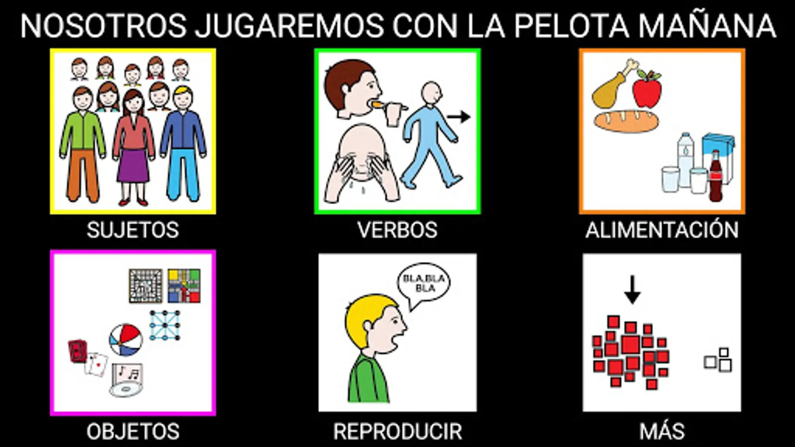 In accumulative mode, it allows the creation of simple sentences, by the selection of subjects, verbs, objects, adverbs and adjectives. Upon the completion of the whole sentence created by picts, the system reads the complete sentence.