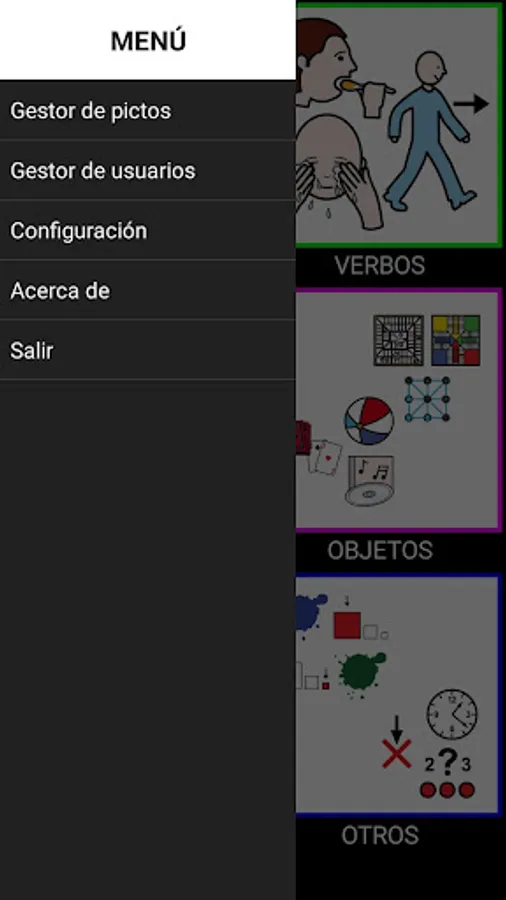 The application uses the Picts of ARASAAC (http://arasaac.org/), created by Sergio Palao and distributed with Creative Commons license (BY-NC-SA), but you can configure it to use other Picts and even real images.