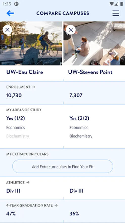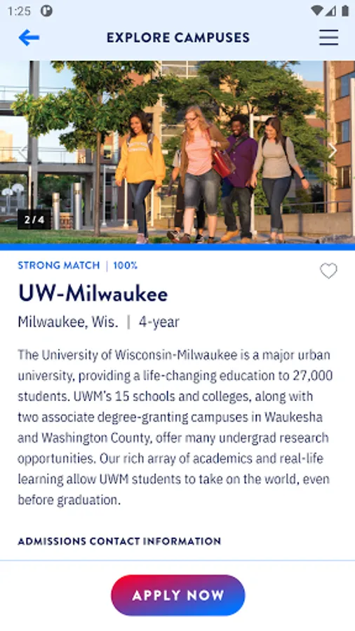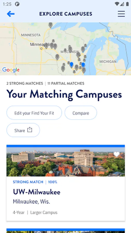 UW Journey is your official guide to the University of Wisconsin System. Explore and compare all 26 UW campuses to find which UW is right for you. When you complete a simple profile, UW Journey will show you which UWs are your best match. You can then compare your UWs, side by side, in map or list view, and dig into the details of what makes each campus a good fit. Share your favorites with family and friends and use the results to jump off into more research. When you’ve decided where you want to apply, UW Journey guides you through the admissions process with all the dates, deadlines, and applications statements you’ll need for each campus to stay on track. Get reminders about upcoming deadlines and tour dates synced directly to your calendar so you never miss a beat. And finally, UW Journey helps you cover the basics on financial aid, including all the priority deadlines for financial aid at each campus. Start your UW Journey, today.