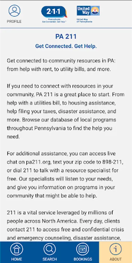 For additional assistance, you can access live chat on pa211.org, text your zip code to 898-211, or dial 211 to talk with a resource specialist for free. Our specialists will listen to your needs, and give you information on programs in your community that might be able to help.