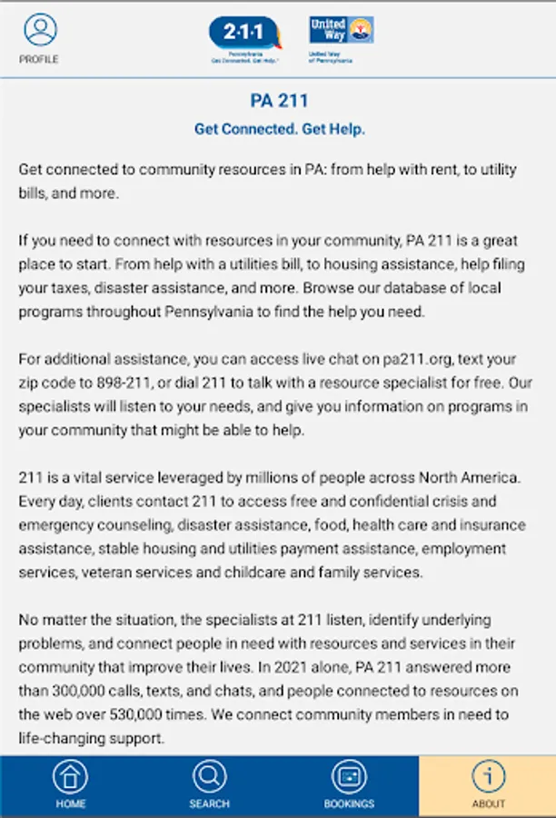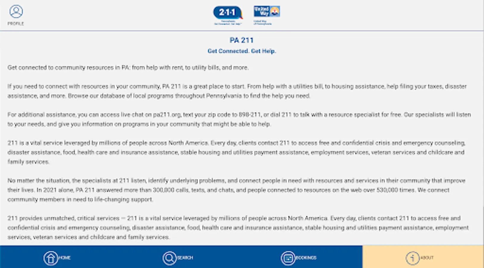 211 meets real needs in real time — In 2021 alone, PA 211 connected Pennsylvanians to community resources over 830,000 times, helping provide life-changing support. The top needs addressed during this time were housing, utilities assistance, health and COVID-19, employment and income, and food. 211 has its finger on the pulse of community needs unlike any other network.