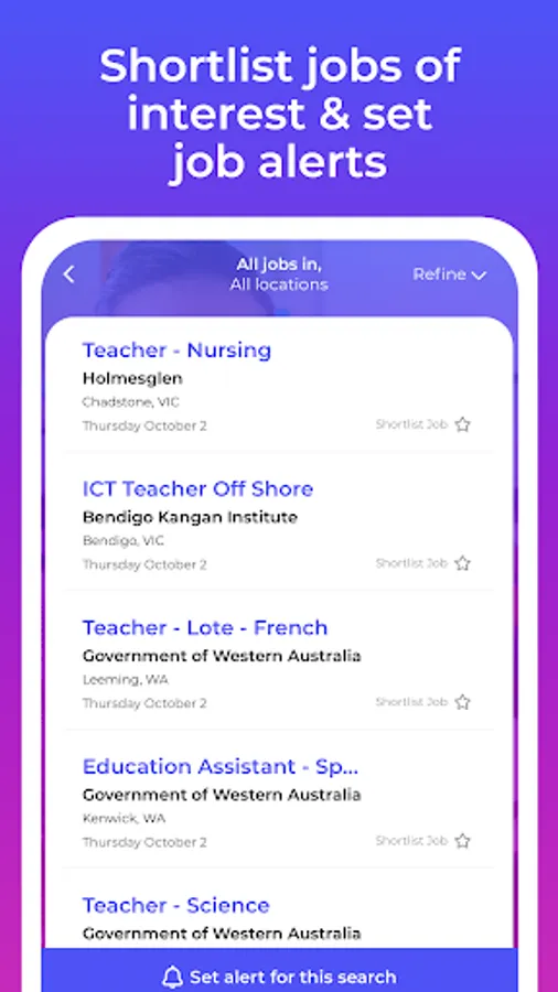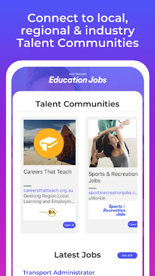 Education Jobs App allows you to seek Education jobs anytime and anywhere, so you can find next career move Government websites and job boards across Australia, while on the run. It also connects you to local, regional the industry based Talent Communities to access exclusive employment opportunities added from member employers.