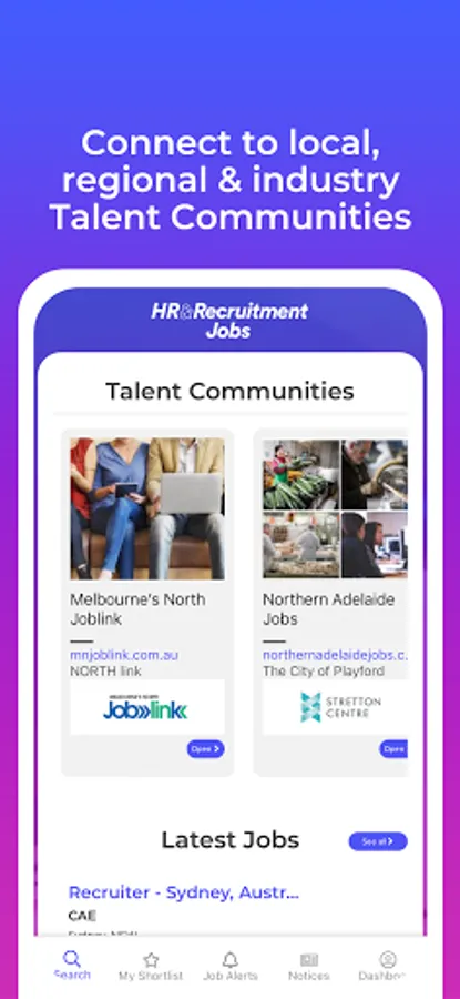 The HR & Recruitment Jobs App connects you to local, regional, project and industry based Talent Communities so you can access exclusive employment opportunities from employers. Talent Communities also connect you to work, education, events, support and information for employment options and career pathways of interest.