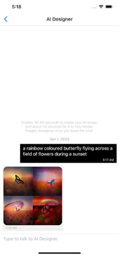 AI Designer is like when you're taking a trip, and you stop for a little break in the middle of your journey. Just like when you go on a car ride and you stop for a snack or to stretch your legs. The AI Designer bot in the app is like a helper that you can talk to during that break. You can tell it what you want to say, and it will turn your words into a picture, like a painting or a drawing, to help you express your ideas. It's like having a friend who can draw what you're thinking and make it into a special picture just for you.