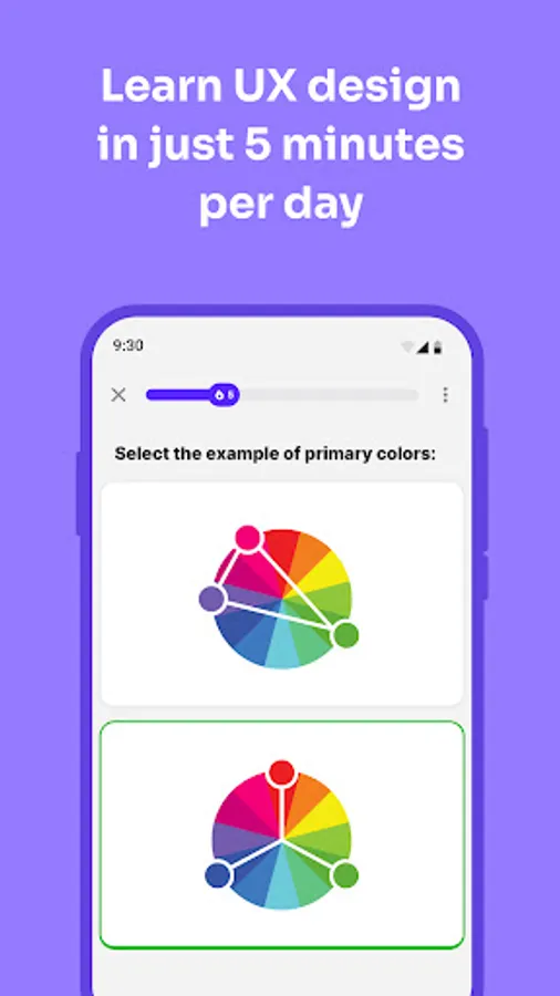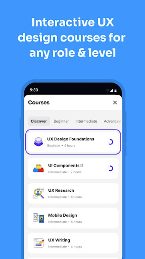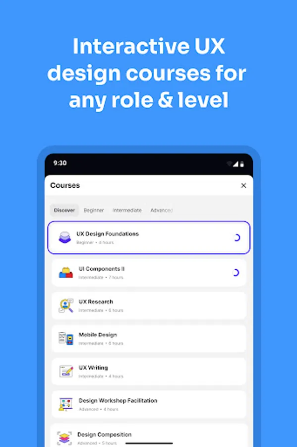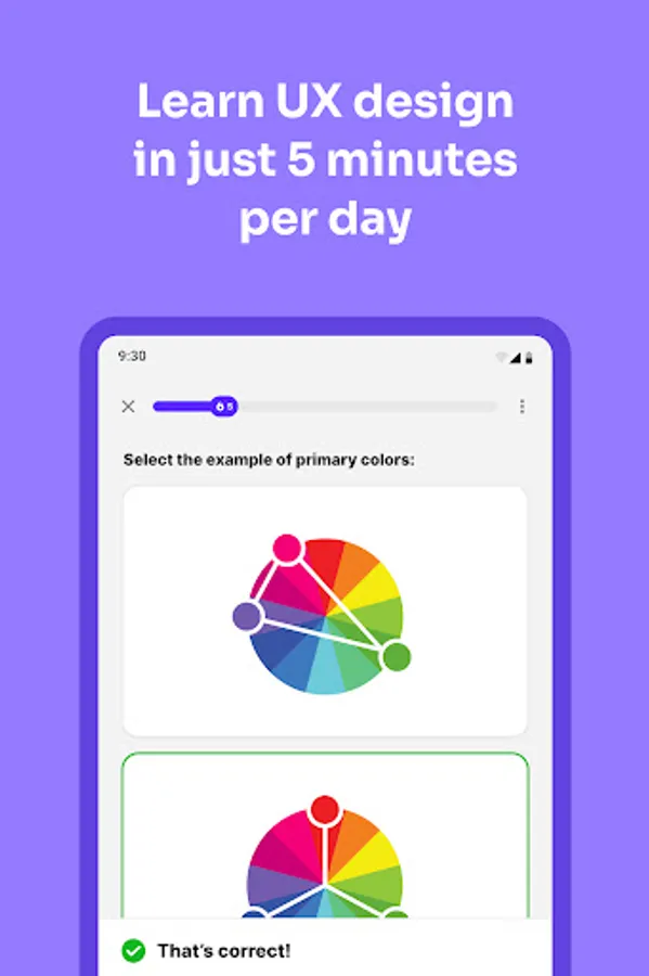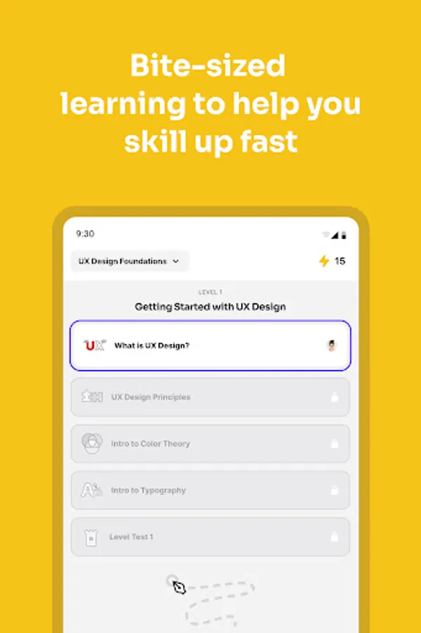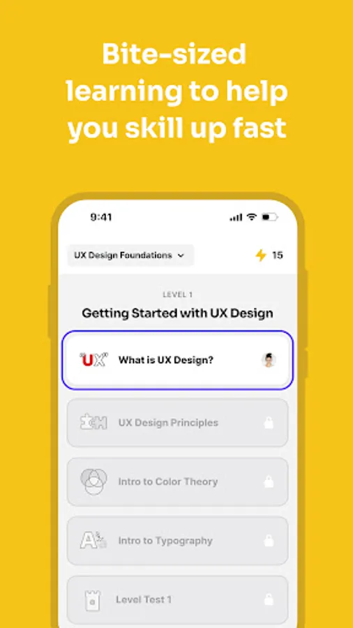 • We don't waste your time. Bite-sized learning lets you learn at your own pace and easily build a strong foundation in UX, UI, and product design skills.