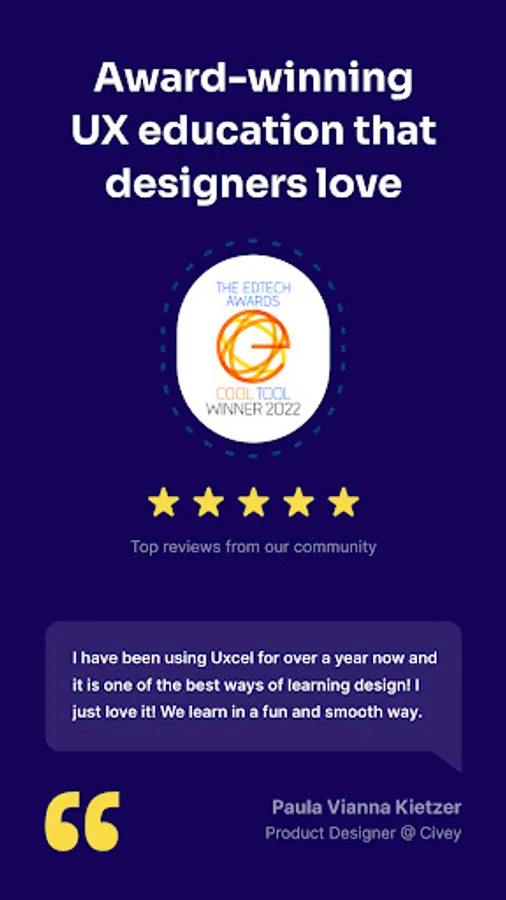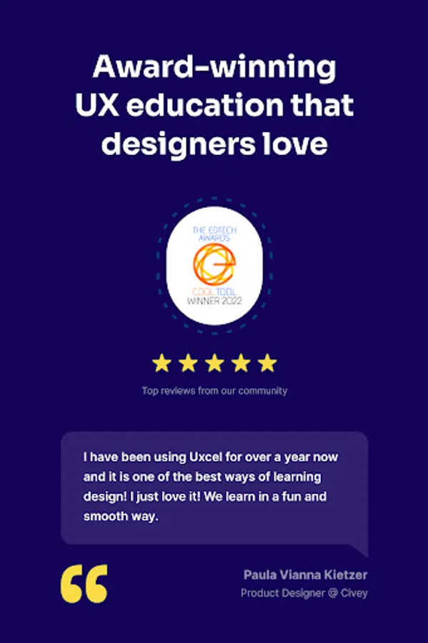 • "Uxcel really is the Duolingo of UX/UI! It makes it very easy to learn by chunks on a daily basis, so interactive and fun! And the content is extremely helpful, I've learned tons already! Very well invested money and time." — Diana Mancia, Product Designer.
