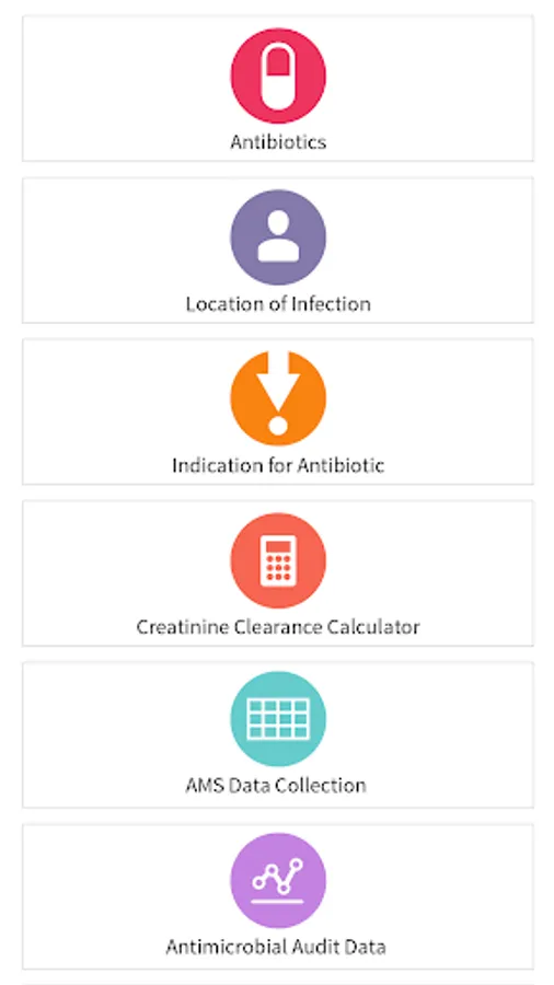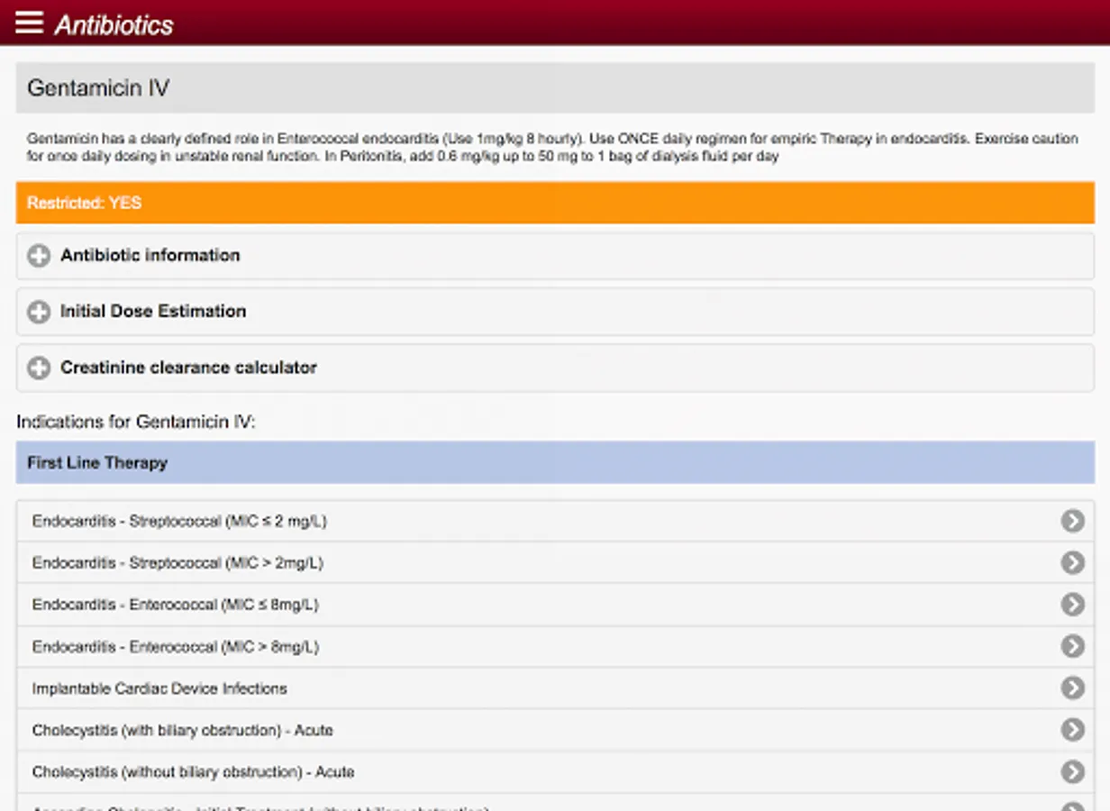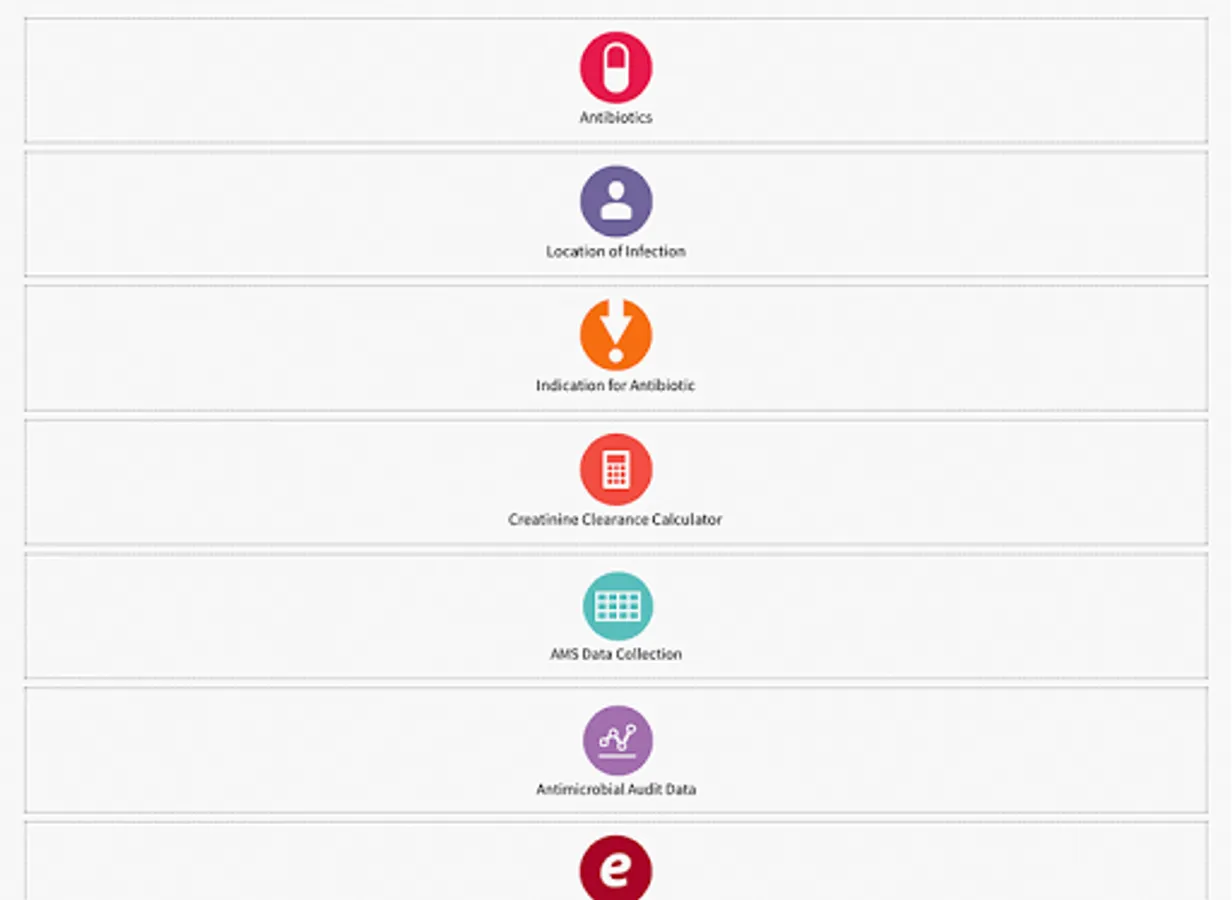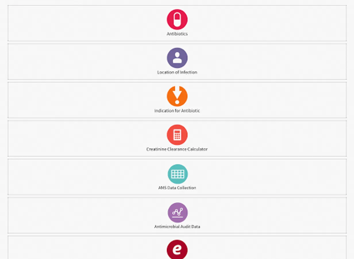 The app supports point of care decision making for medical, pharmacy and nursing staff with practical advice on appropriate antibiotic selection based on indication, adult and paediatric antibiotic creatinine clearance based dosing and standardized antibiotic administration methods.