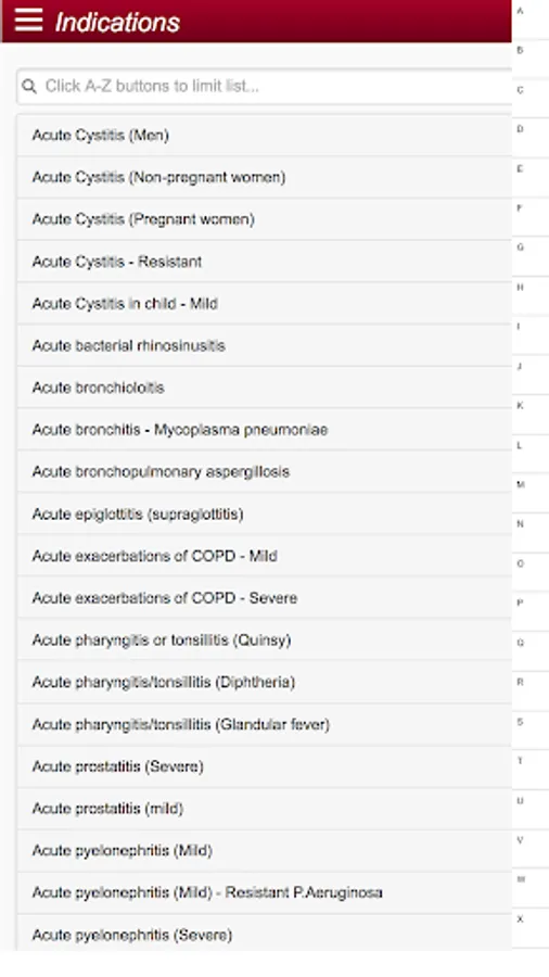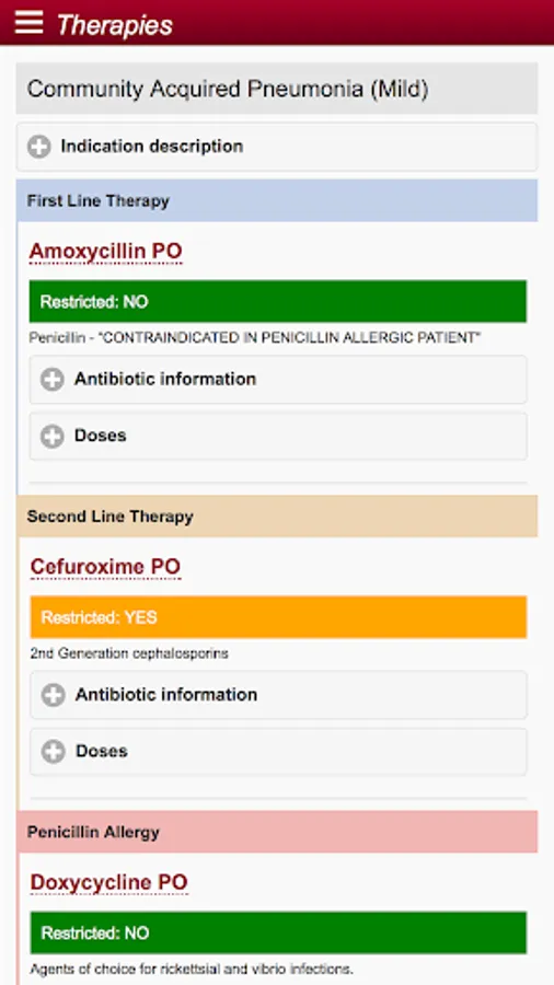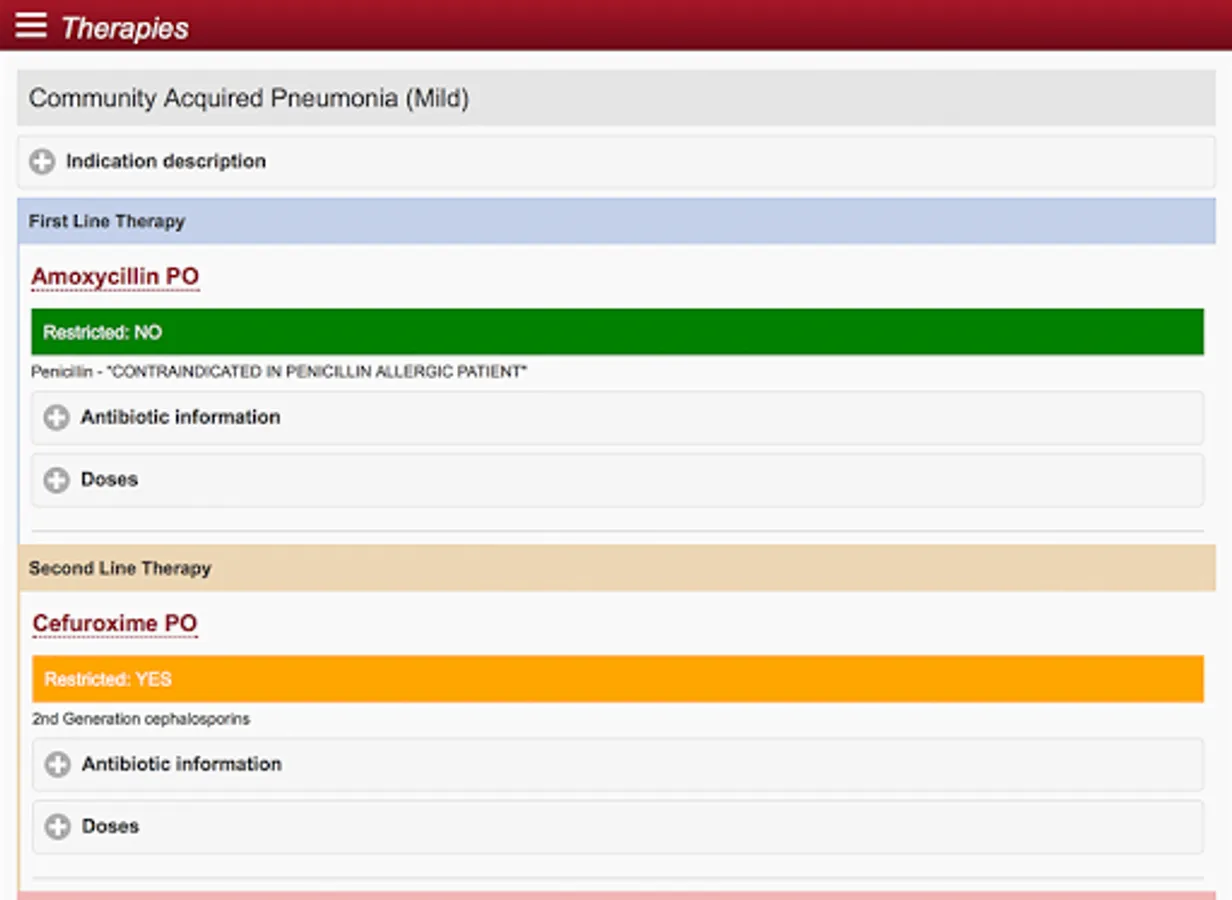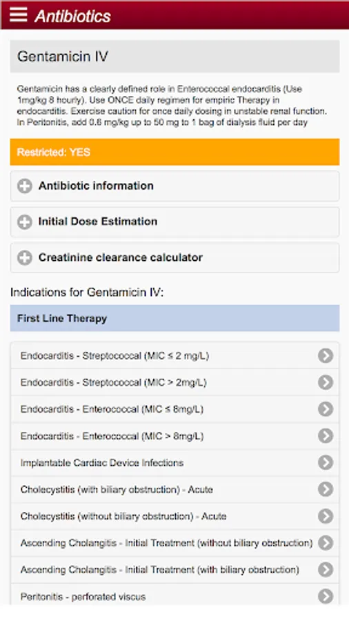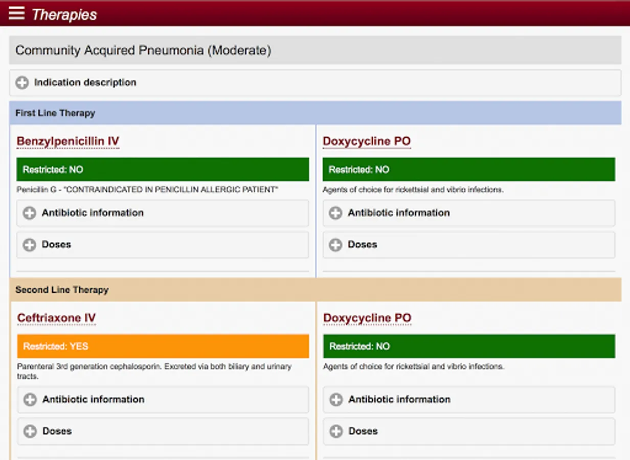 The app supports point of care decision making for medical, pharmacy and nursing staff with practical advice on appropriate antibiotic selection based on indication, adult and paediatric antibiotic creatinine clearance based dosing and standardized antibiotic administration methods.