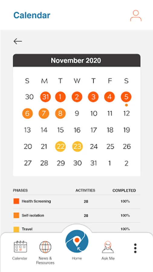The app will display the daily activities to be completed and will gather the completion status to monitor their journey. It will also alert the person in case he/she misses or violates any regulation.