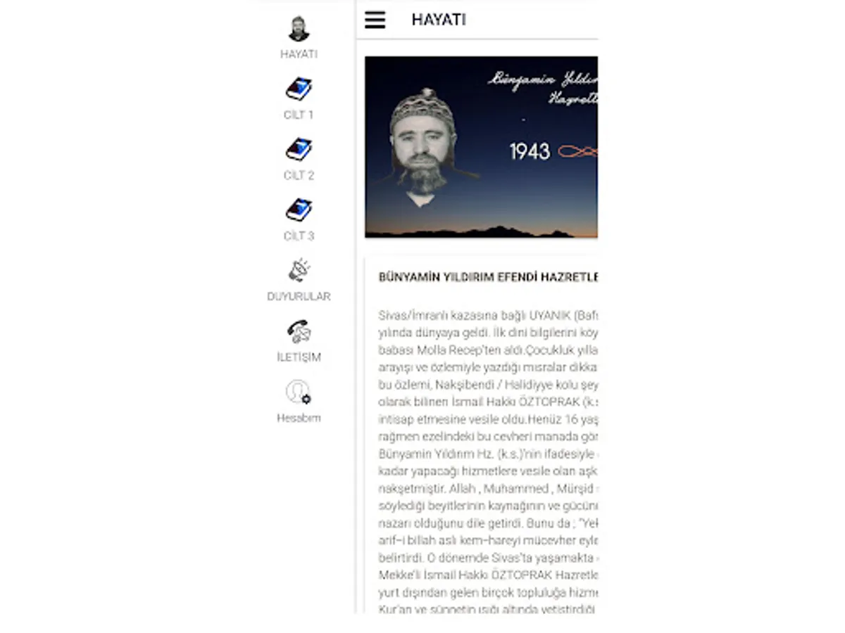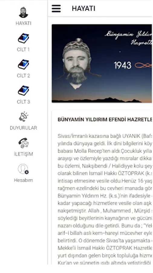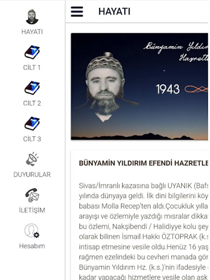 He was born in 1943 in UYANIK (Bafsu) village of Sivas/İmranlı district. He received his first religious knowledge from his father, Molla Recep, who was the imam of the village. The verses he wrote in search of mysticism and longing in his childhood attracted attention. This longing of him led him to join His Holiness İsmail Hakkı ÖZTOPRAK (k.s), known as Kutbul Azam, the sheikh of the Nakşibendi / Halidiyya branch. Although he is only 16 years old, his sheikh, Bünyamin Yıldırım, who sees this gem of his predecessor in the meaning of Hz. In the words of (k.s.), the love that was instrumental in the services he would do until the end of his life, he engraved the divine in his heart. He stated that the source and power of the couplets he said on the love of Allah, Muhammad and the Murshid was the gaze of the sheikh.