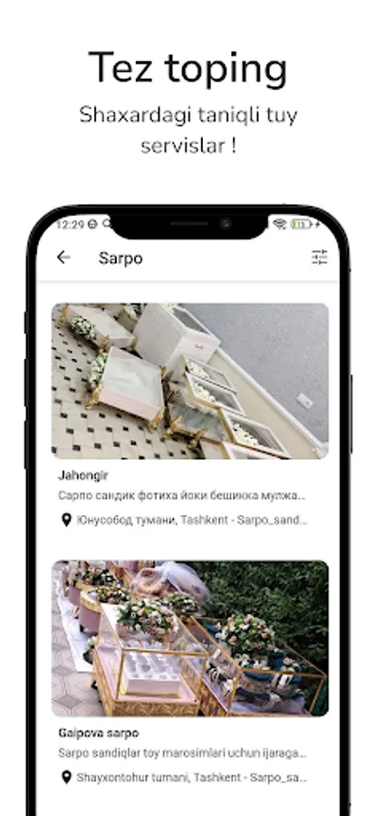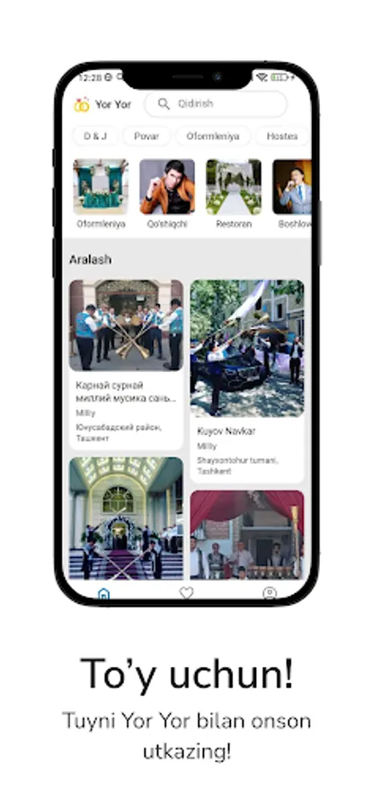 Tuy uchun kerakli narsalarni bitta programma orqali toping. Kartej, Tuyxonalar, Sarpo, Gullar, Sovgalar, Studiyalar va ko'p.