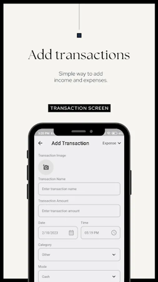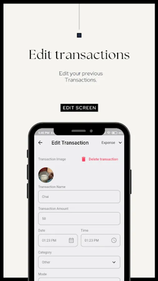 Income and Expense tracking: Add new transactions, categorize them, and edit or delete them as needed.