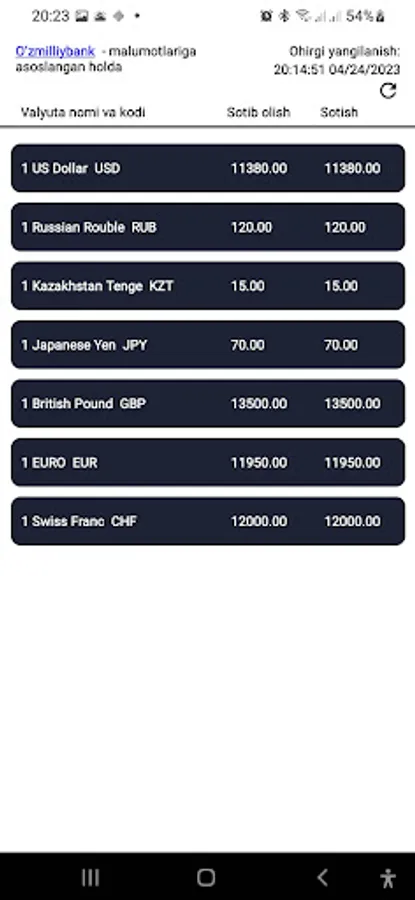 Ushbu ilovada https://nbu.uz/uz/exchange-rates/ sahifasidagi malumotlar ko'rsatilgan