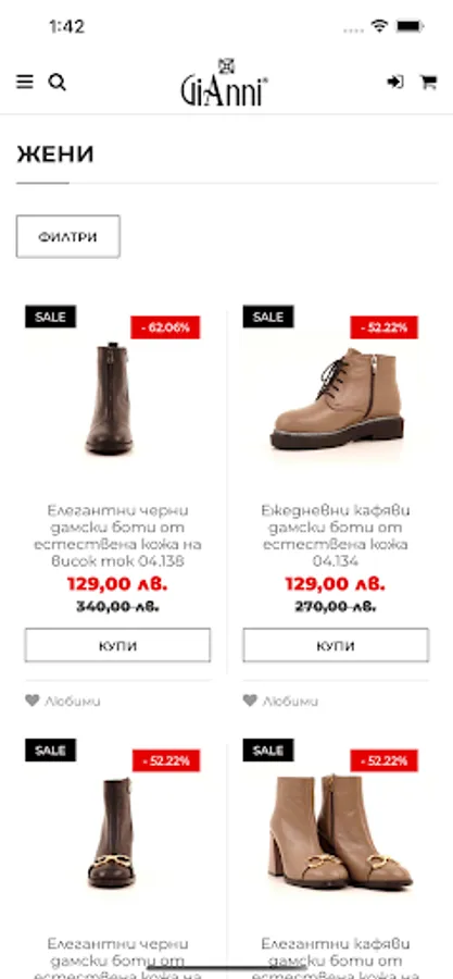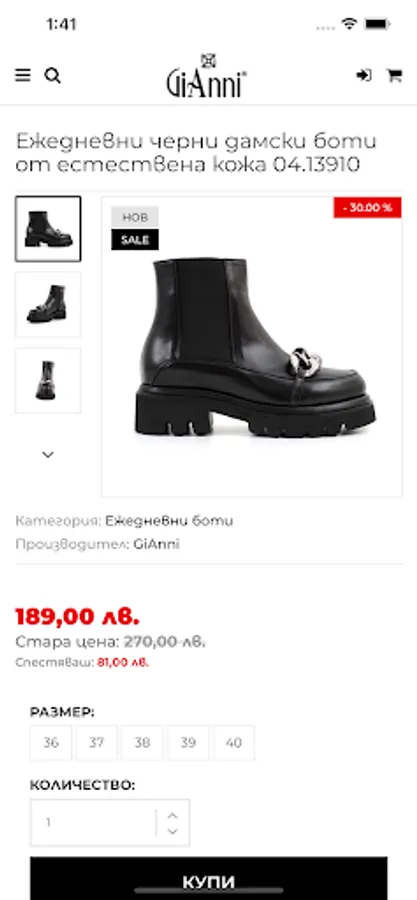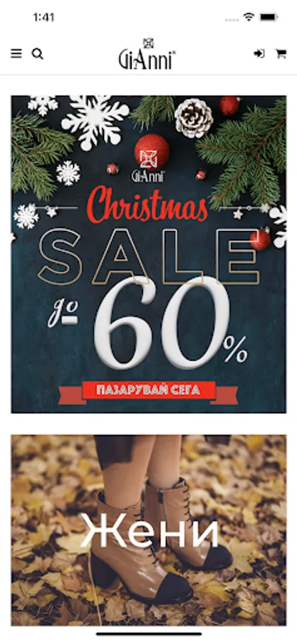 Това е мобилната апликация за онлайн пазаруване на Фирма GiAnni. Тя се занимава с търговия на изделия от висококачествена естествена кожа - дамски обувки,мъжки обувки,спортни/кежуъл обувки, чанти,куфари, ботуши, сандали, с гарантирано качество за всеки вкус.