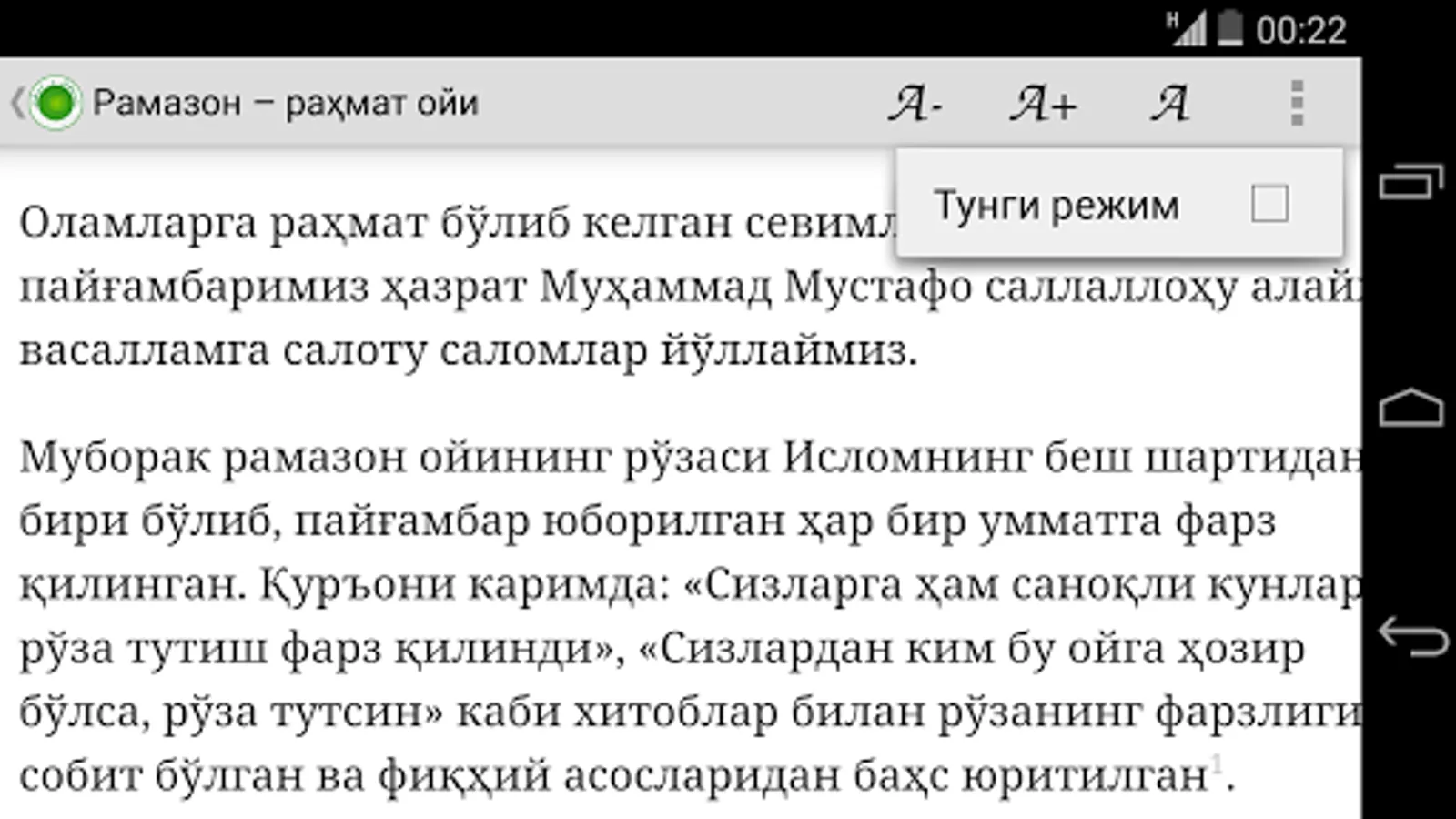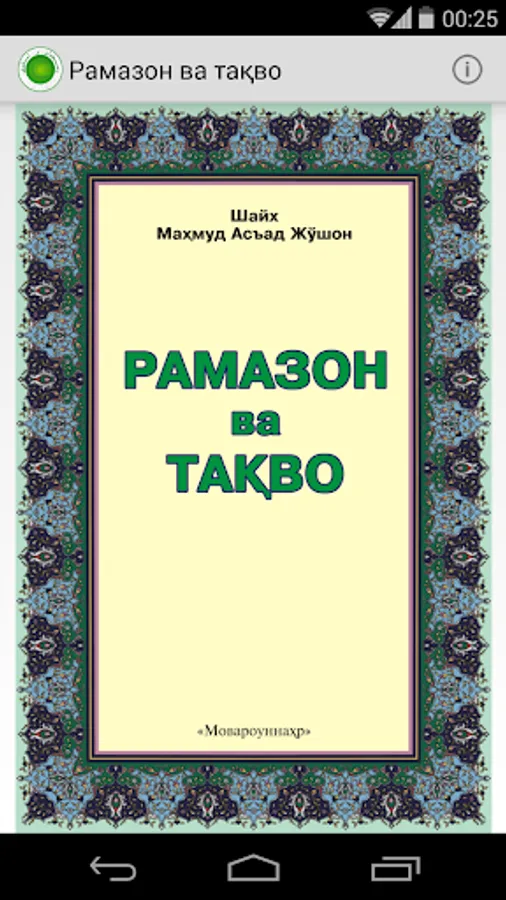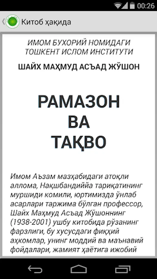 Имом Аъзам мазҳабидаги атоқли аллома, Нақшбандиййа тариқатининг муршиди комили, юртимизда ўнлаб асарлари таржима бўлган профессор, Шайх Маҳмуд Асъад Жўшоннинг (1938-2001) ушбу китобида рўзанинг фарзлиги, бу хусусдаги фиқҳий аҳкомлар, унинг моддий ва маънавий фойдалари, жамият ҳаётига ижобий таъсири ва тақвонинг аҳамияти ҳақидаги бир қатор муҳим шаръий масалалардан баҳс юритилади.