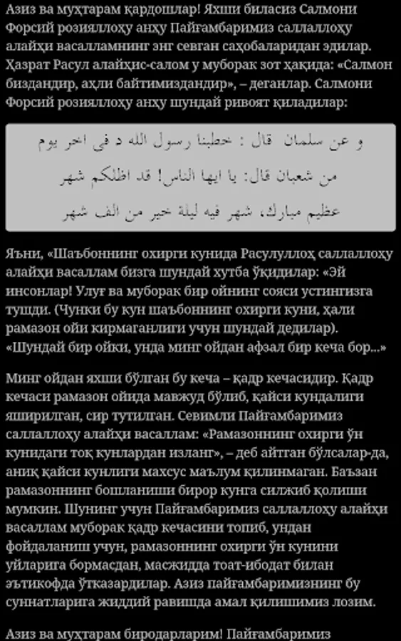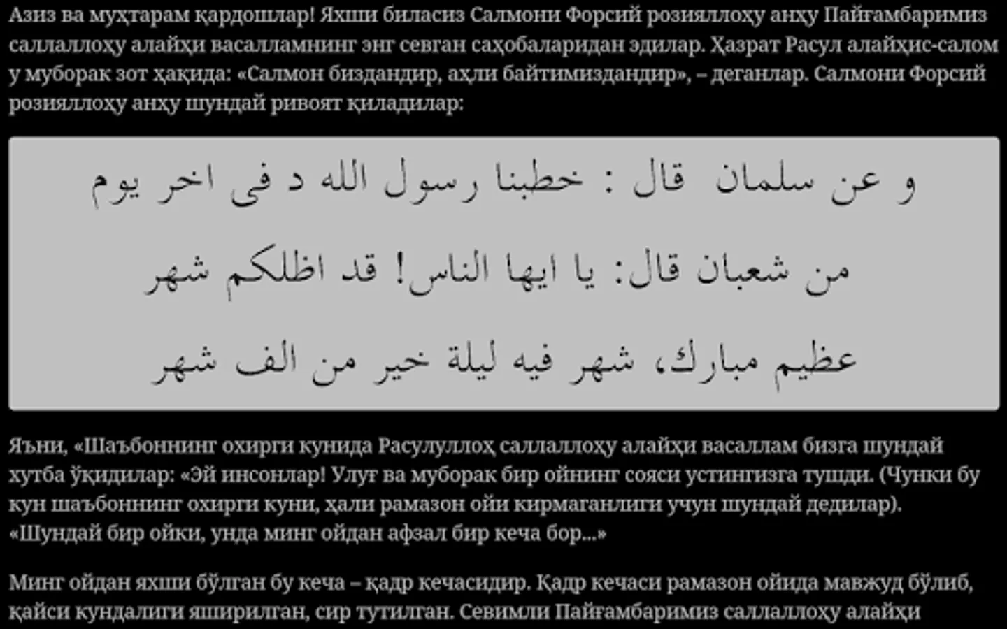 Шунингдек, асарда муборак уч ойлар ва муборак кечалар фазилати ҳақида маълумот ва тавсиялар берилган.