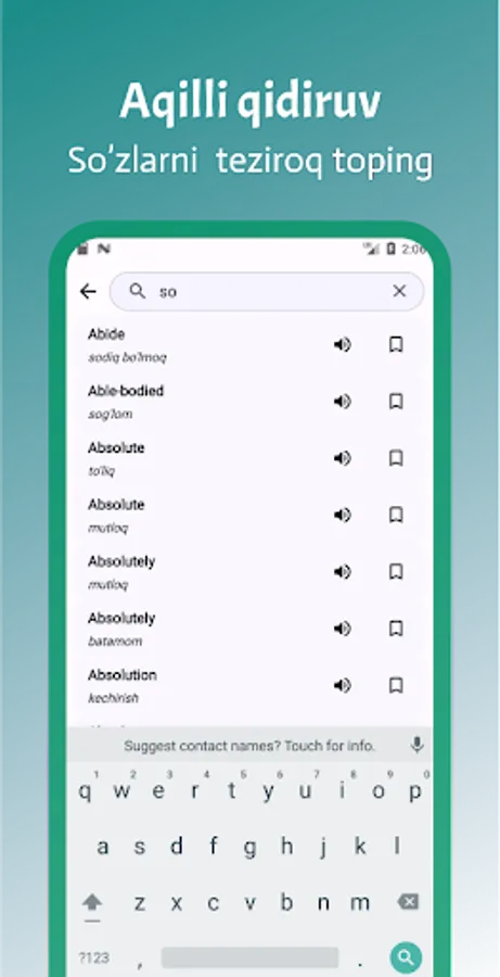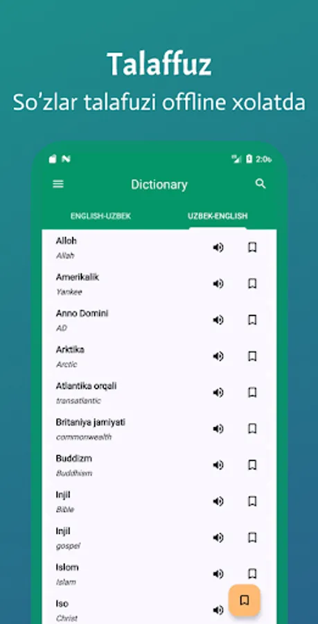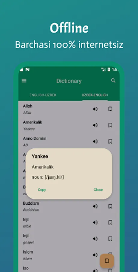 Ilova to'lliq offline(internetiz) ishlaydi va har bir so'zni talafuzini eshitishingiz mumkin.