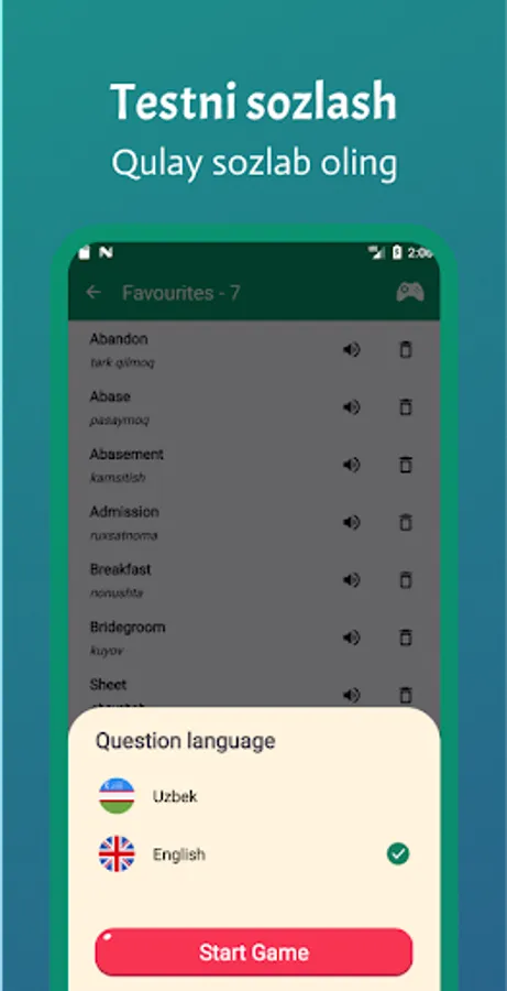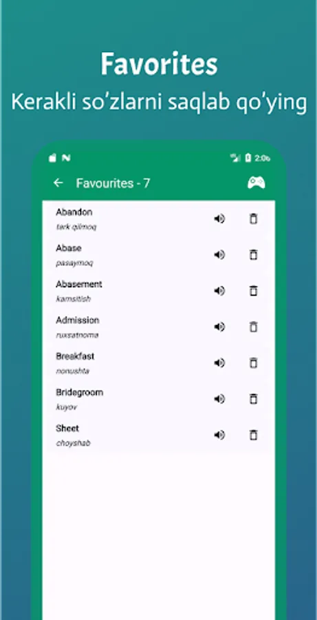 Favorites oynasida yeg'ilgan so'zlarni Test qilib tezda yodlab olishingiz mumkin.