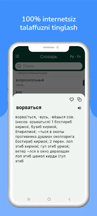 Ilovada Rus va Kril alifbosiga mo'ljallanganbo'lib 40,000+ dan ziyot o'zlarni o'z ichigq oladi.