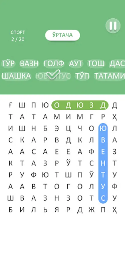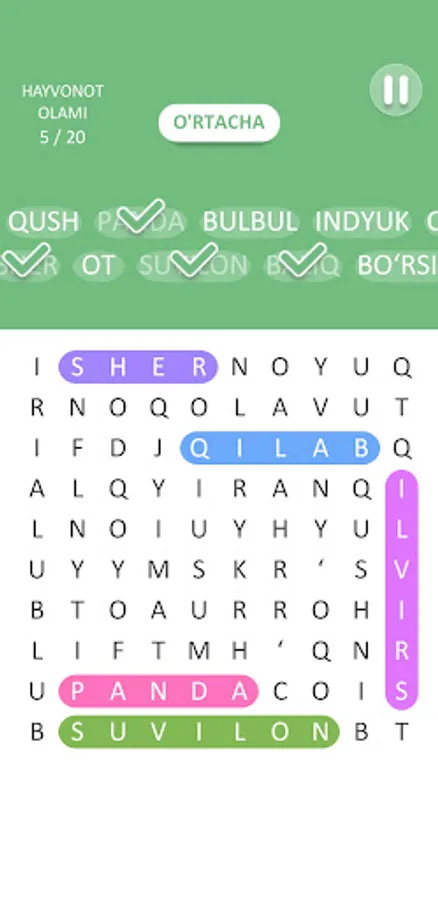 Barmog‘ingizni bir katakchadan qo‘shni katakchaga surgan holda yashiringan so‘zlarni toping. Barcha darajalar to‘liq tekshirilgan va to‘g‘ri berilgan.