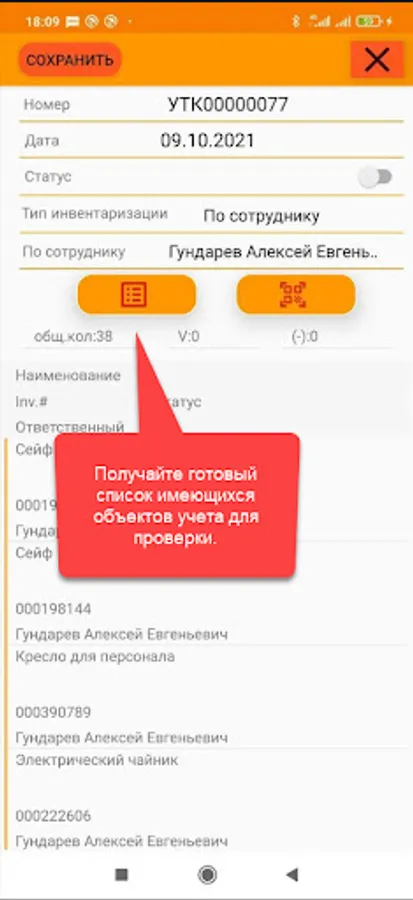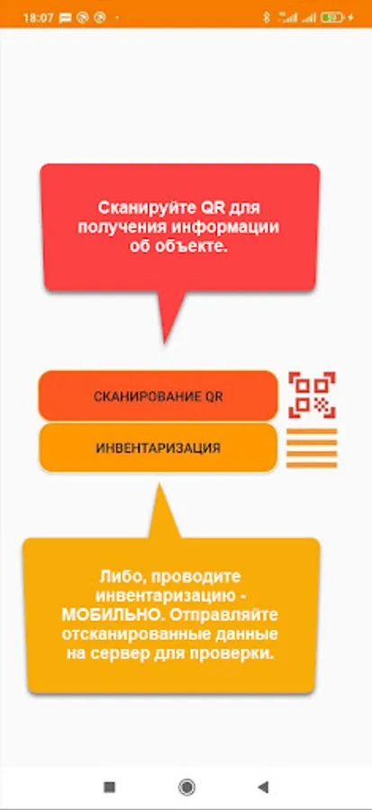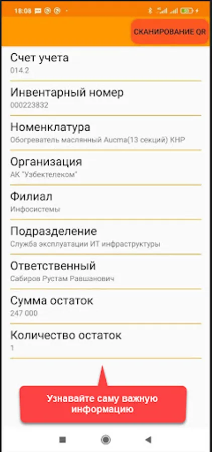 The application is designed to automate the inventory of non-current assets and household items of the enterprise. The functions of the application include receiving information by QR code from the server, as well as synchronized inventory with the server.
