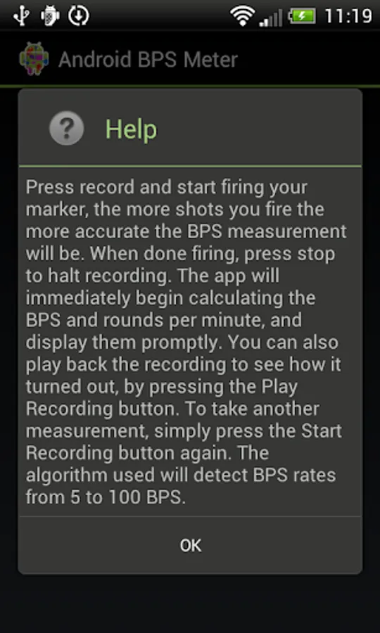 How to use the app: Simply press start recording and begin firing your marker. The more shots you fire the more accurate the result will be. Once you have fired enough shots (~1 second of shooting) press stop recording, and the app will immediately begin calculating the result. This may take a short duration. The result will be displayed once ready. The recording can also be played back.