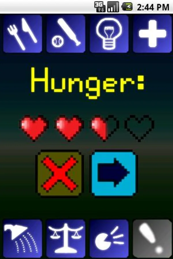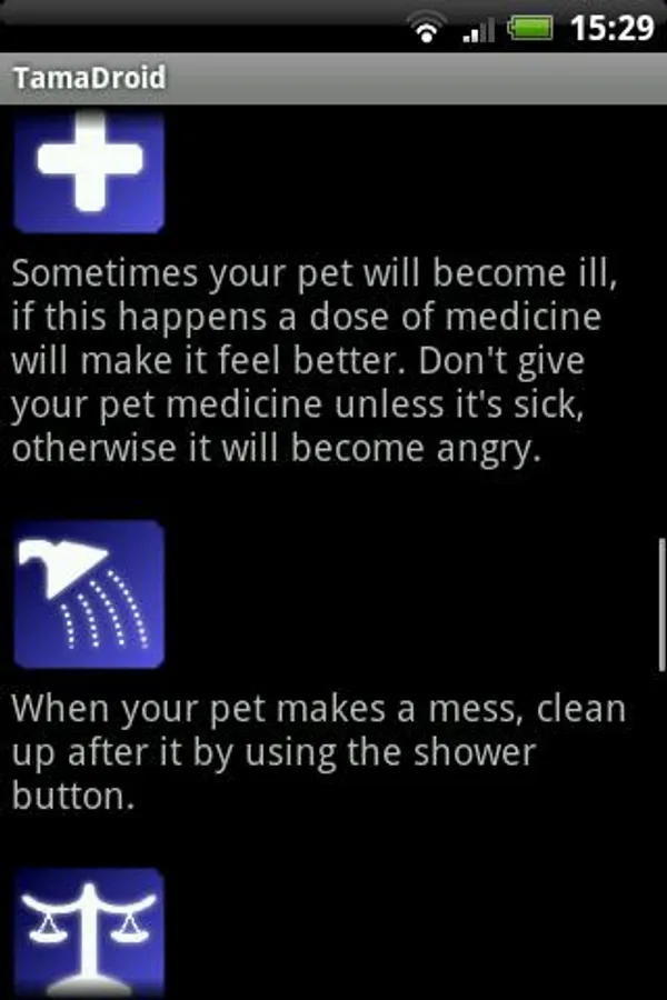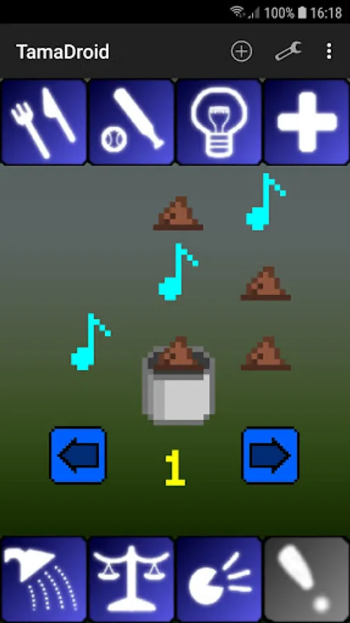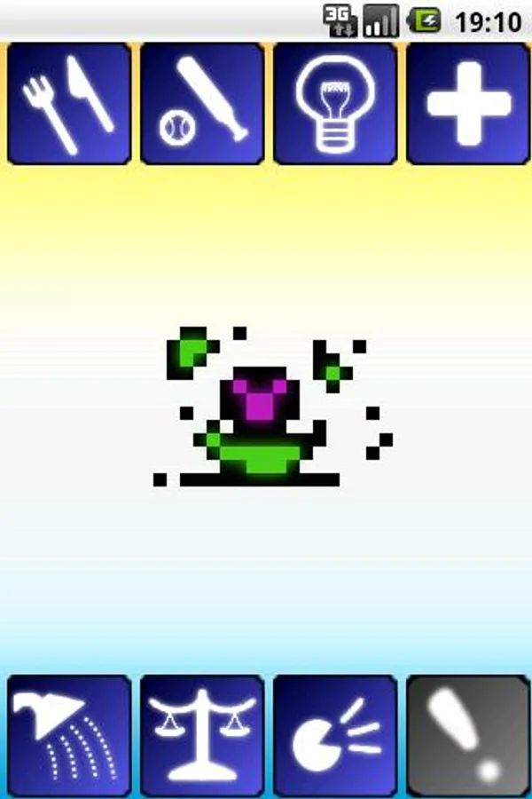 This app is inspired by the old Tamagotchi keychain pets from the 90s. What you do is care for a virtual pet like you would a real one, by taking care of its needs. You will need to feed it, play with it, wash it and discipline it. The buttons surrounding the pet are used to interact with it. As the tamadroid becomes older it will evolve, and what it turns into depends on how well you care for it. There are a total of 22 evolutions, can you find them all? Tip: Experiment with different levels of happiness, discipline and weight.