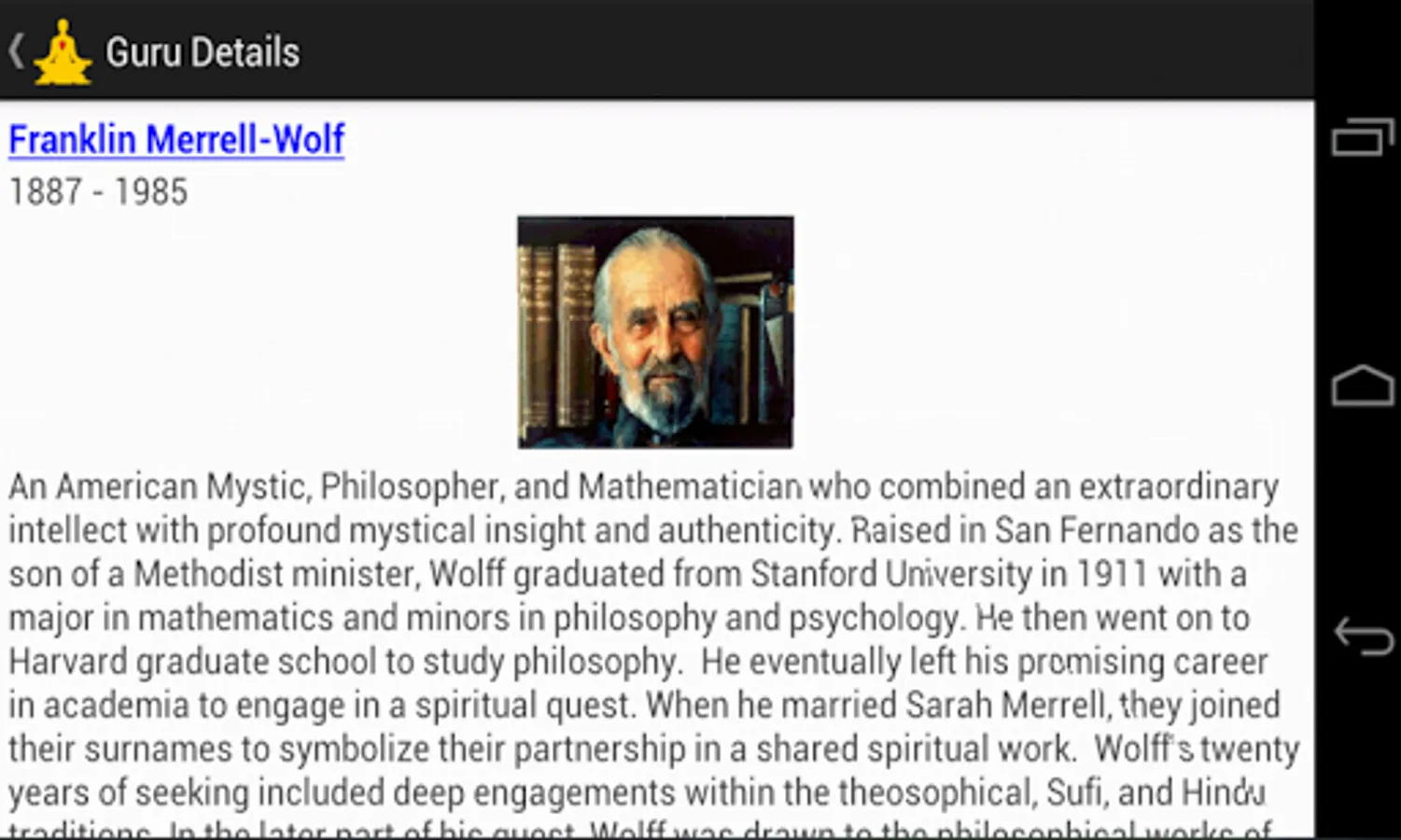 For seekers on the path to enlightenment. Includes a listing of over 250 well known spiritual teachers and philosophers from all eras, including living teachers, with a brief biography for each and links to internet sources for more research. Also a dozen articles on spiritual topics such as meditation and enlightenment. Designed especially for easy use on 10" tablet screens.
