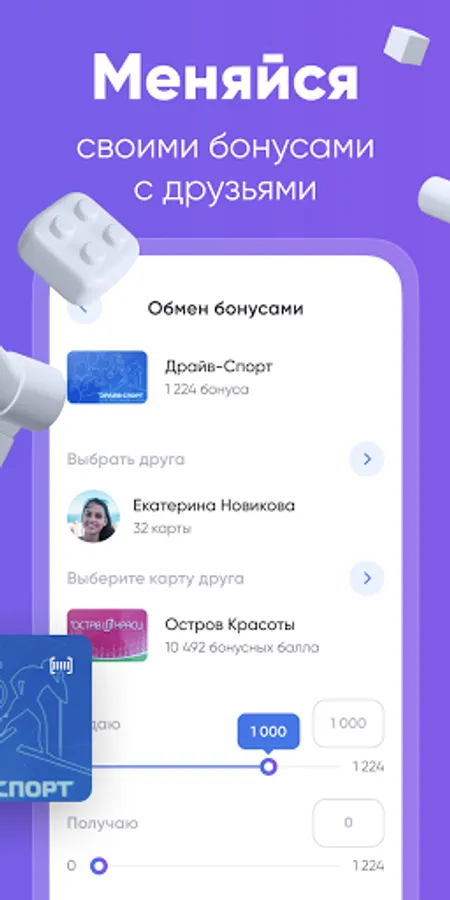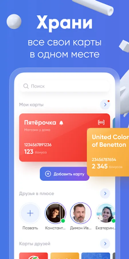 • Good company: use the cards by yourself or with friends and family. Invite the right person to the app and share any loyalty card or points with them. Accumulate bonuses with friends and family. Share bonuses within your groups.