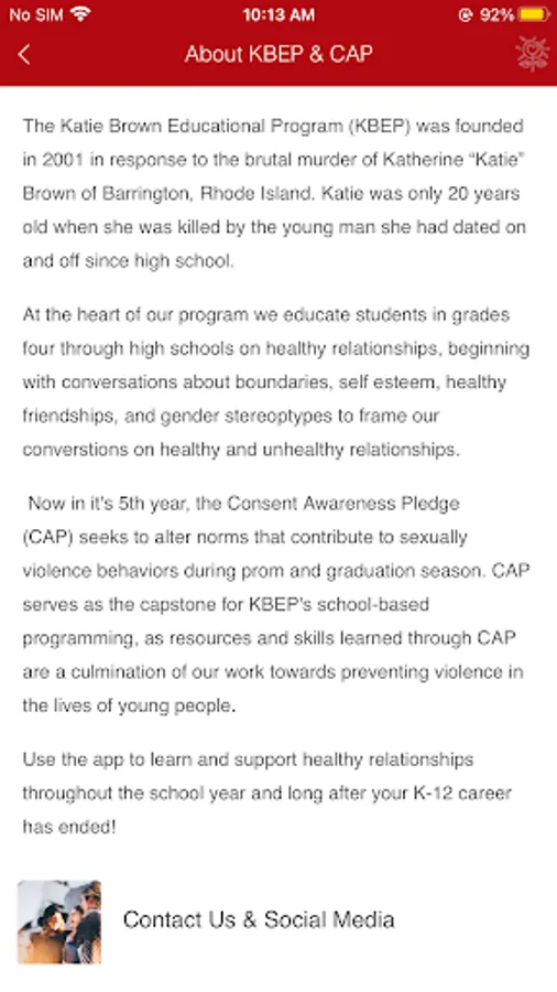 Based on the belief that education is the foundation and channel for permanent change in attitudes and behaviors, the Katie Brown Educational Program (KBEP) promotes respectful relationships by teaching relationship violence prevention. The KBEP Consent Awareness Pledge (CAP) serves as the capstone for KBEP’s school-based programming, as resources and skills learned through CAP are a culmination of the integrative experience of our work towards preventing violence in the lives of young people. The KBEP Consent Awareness Pledge mobile app is a versatile tool that allows students, parents, and community supporters to learn and support healthy relationships through the end of the school year and long after a student's K-12 career has ended. High school juniors and seniors who download the app pledge to promote healthy relationships and to acknowledge that they understand and accept the consent (or lack thereof) of their peers. Through the app, students have on-going access to resources, the CAP pledge, and tips that are vital to student safety. Parents and community members who download the app gain access to the same information that the minors in their care receive. Additionally, the Parent Portal portion of the app allows adults to best equip themselves to have frank conversations regarding consent with the minors in their care.