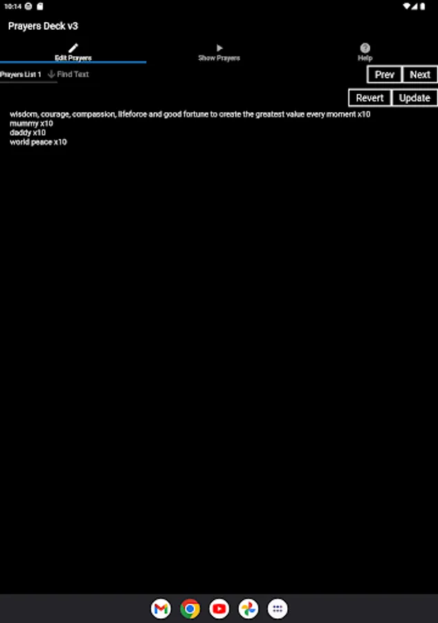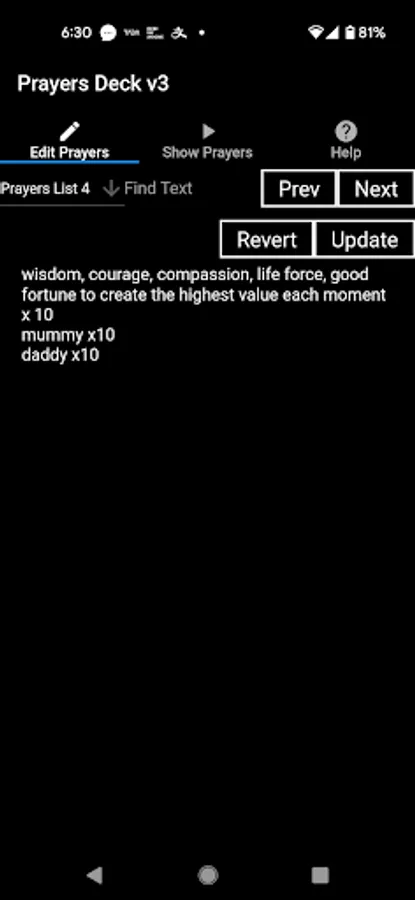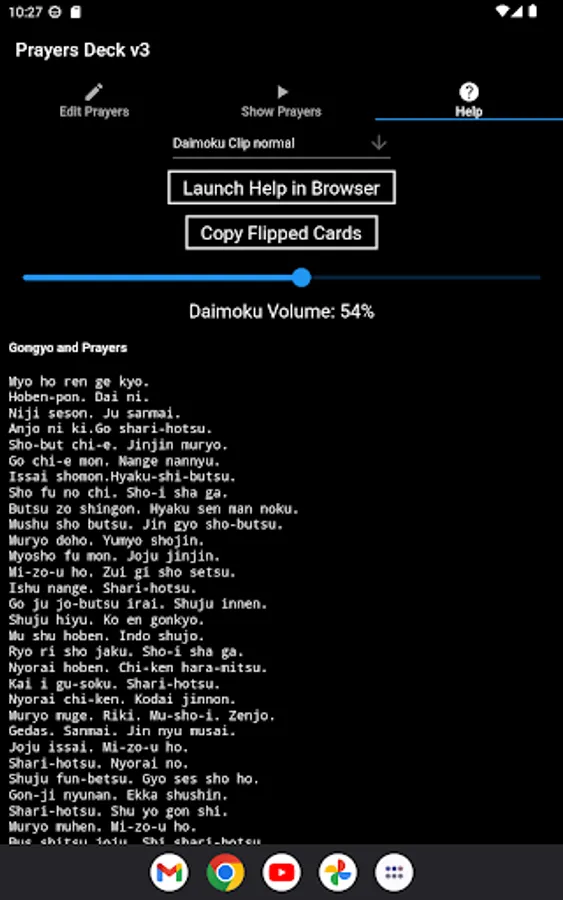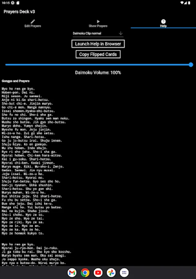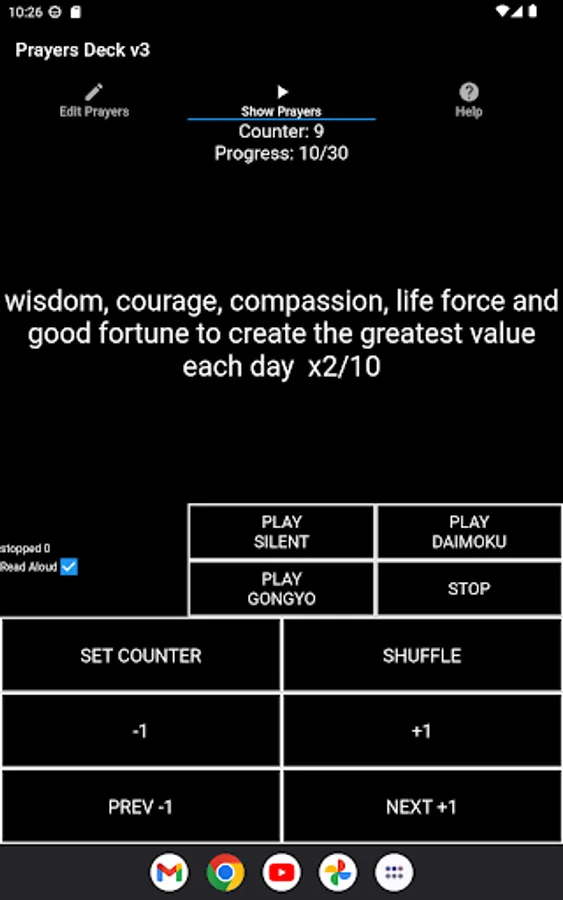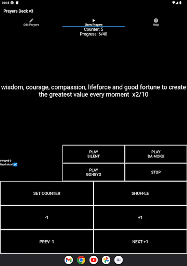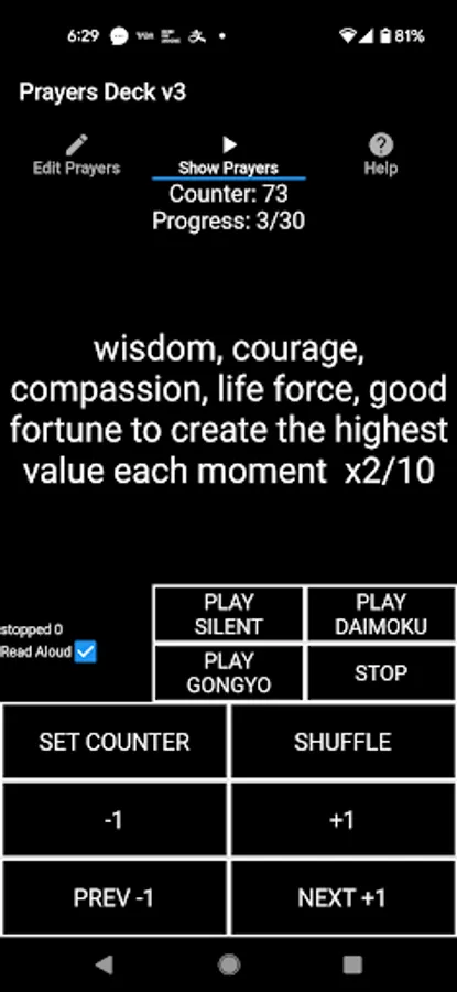 Create a deck of prayer cards digitally and spend 1 minute focusing on each prayer as they are flipped with or without accompanying chanting Nam Myoho Renge Kyo audio. If you are from another religion you can also use this app in silent too. Store up to 10 prayers lists. Can be used as an ad-hoc random generator too.