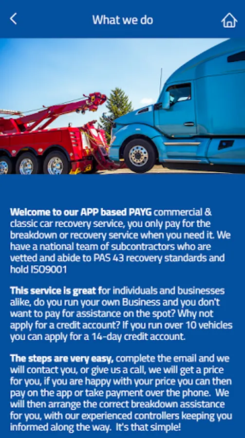 A Pay as You Go Commercial & Classic car recovery service, you only pay for the breakdown or recovery service when you need it. This service is great for individuals and businesses alike. The steps are very easy, the App includes choices for Users to choose how to be 'recovered' by one tap to call, or emaiils, or Text. We arrange the correct breakdown assistance for you, with our experienced controllers keeping you informed along the way. It's that simple!