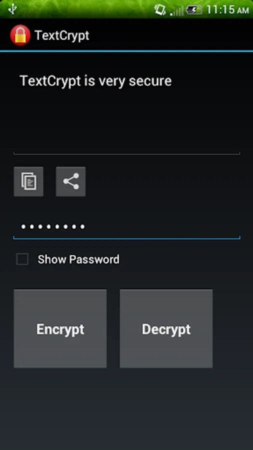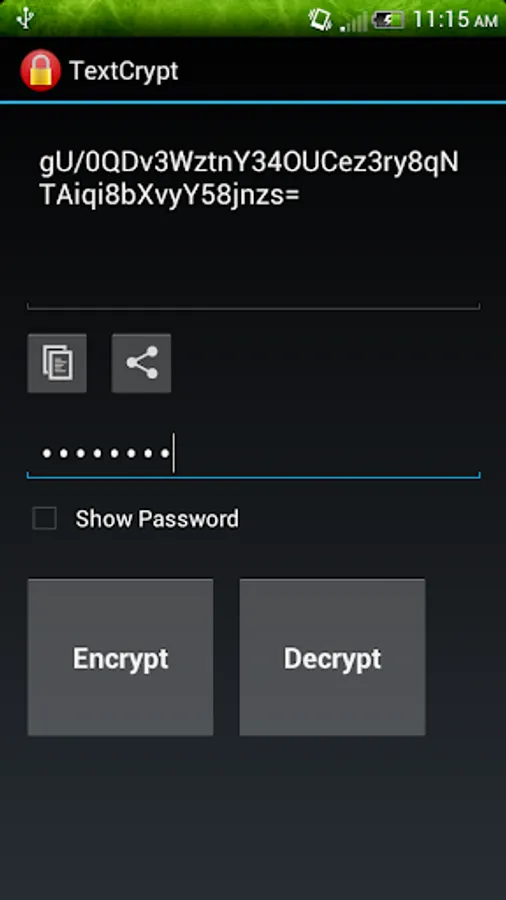 Encrypt text with the industry standard AES algorithm. Easily copy/share the text to other apps. Text can also be shared to TextCrypt for encryption.