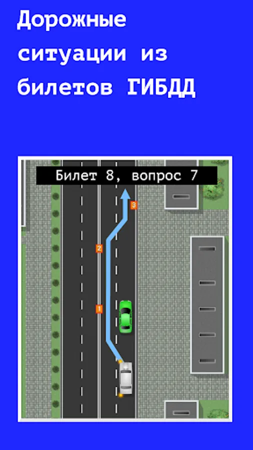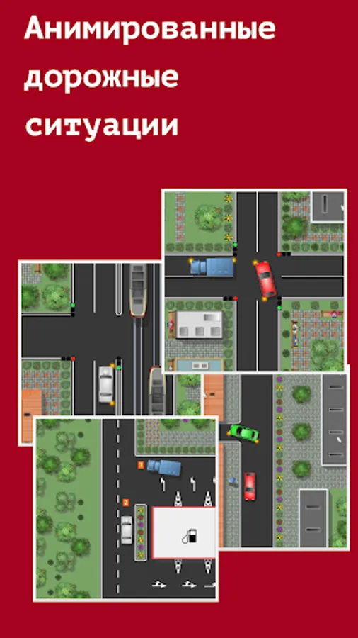 Animated traffic situations allow a deeper understanding of the topic and will be a great addition to solving tickets for a theoretical exam for knowledge of traffic rules for a driver's license in the traffic police.