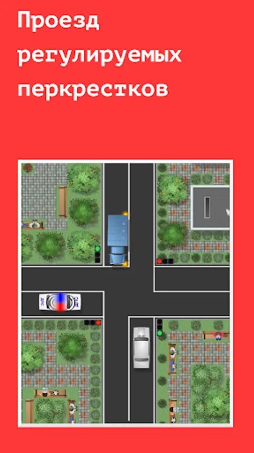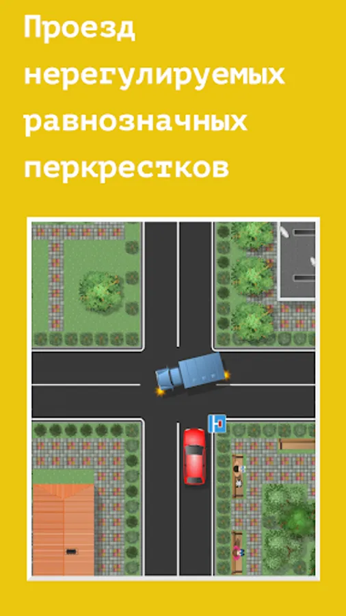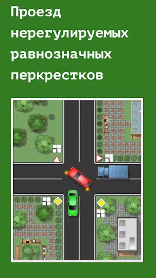 The intersection driving simulator was created to reinforce theoretical knowledge of crossing intersections and is based on the latest requirements of the Russian Traffic Rules for 2023 and covers topics such as: