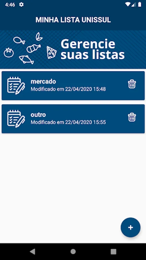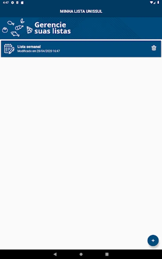 The My List Unissul application has the function of creating and managing shopping lists in chain stores. In order to provide a practical tool for sending purchase requests, the app is available to all customers, allowing them to create and manage offline lists, requiring connection only when sending and synchronizing data.