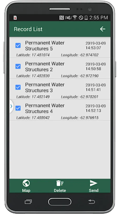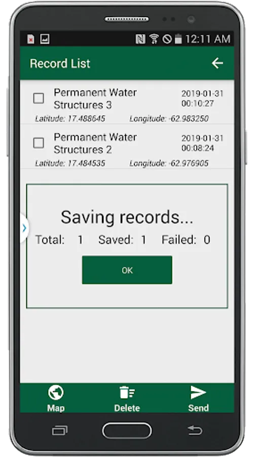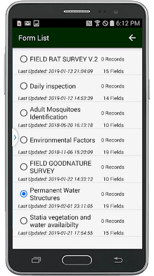After that, users can record data with MobileSurveyForm even while offline, and because the app stores all data saved for each query form, saved records will not be lost even if device loses power. Once internet connectivity is reestablished and the user presses the upload button, all saved data will be uploaded to the server.