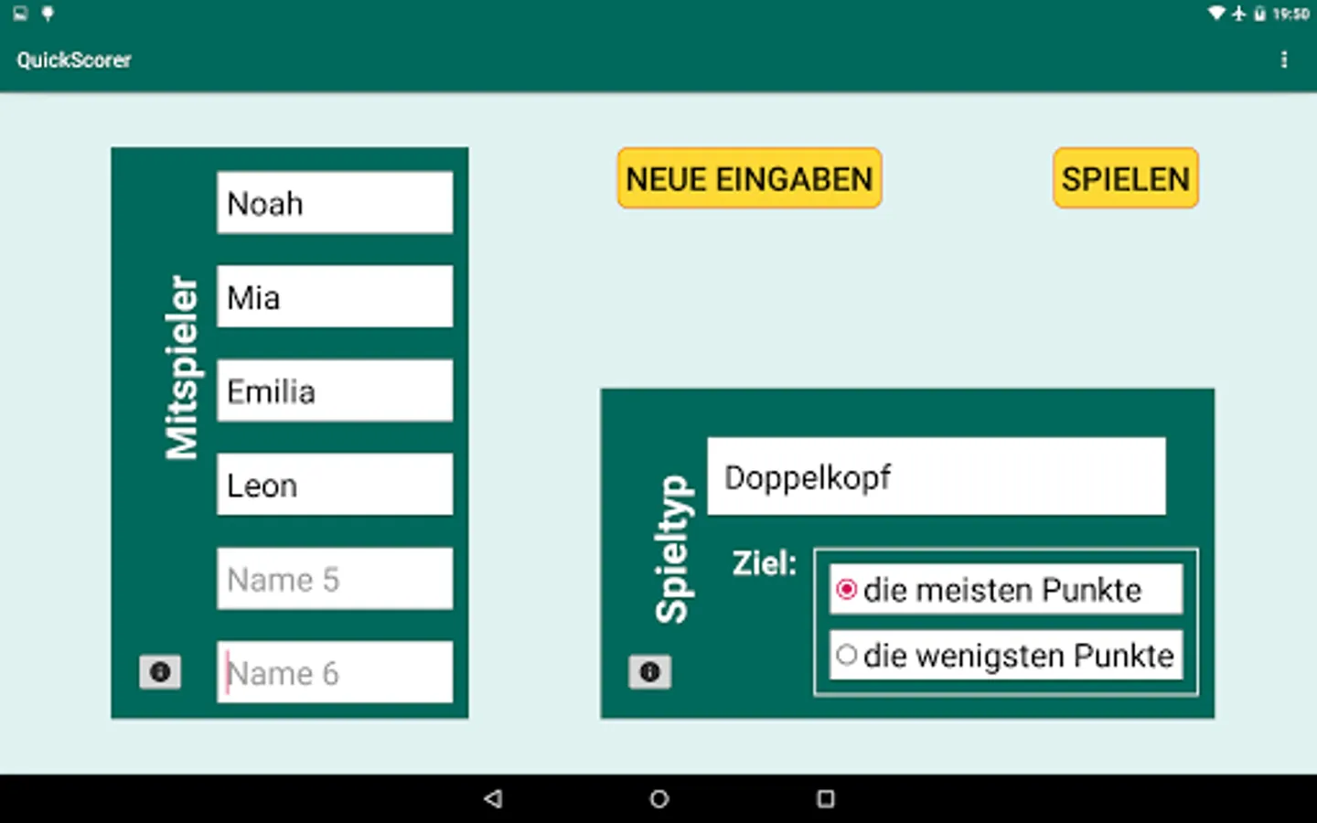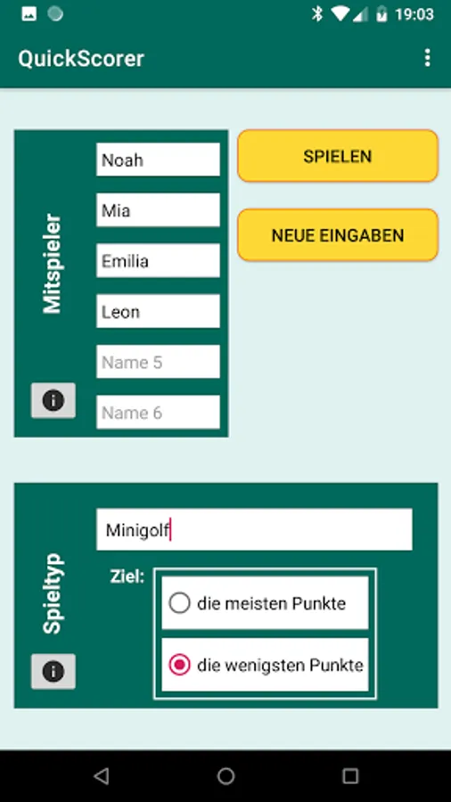 This app does not store or process any personal data according to the GDPR (General Data Protection Regulation), Article 4(1 and 2). It does not communicate with other apps and is not open to information requests from third parties. It does not use cookies and can be used without internet connection. QuickScorer uses the names of players only within a certain game, and exclusively to display the names in the notepad. In addition, the user may choose to enter anonymized player aliases.