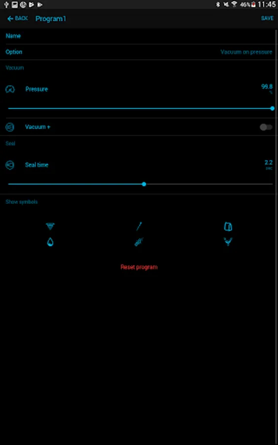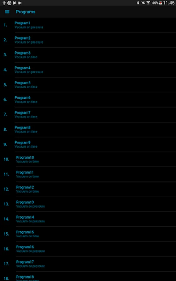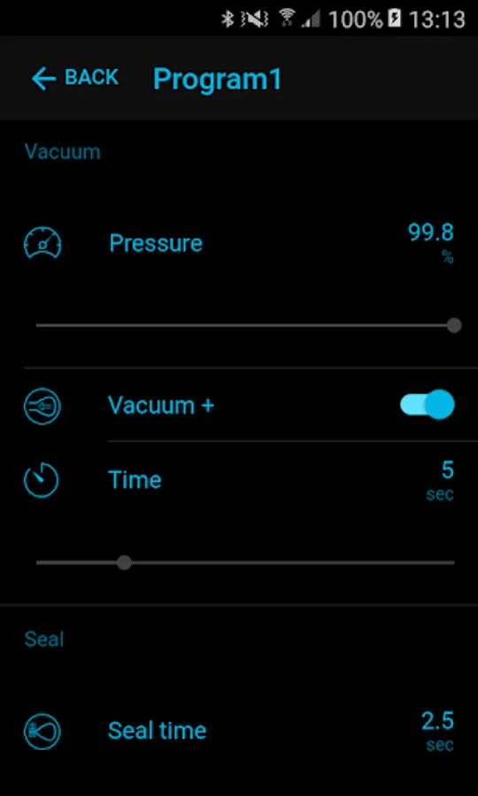 The VacAssist app has a maximum of 20 programs that can be defined and preset. The touch control panel on the machine displays the specific program you selected and the corresponding value of the pressure in percentages or in mbar, or the time in seconds.