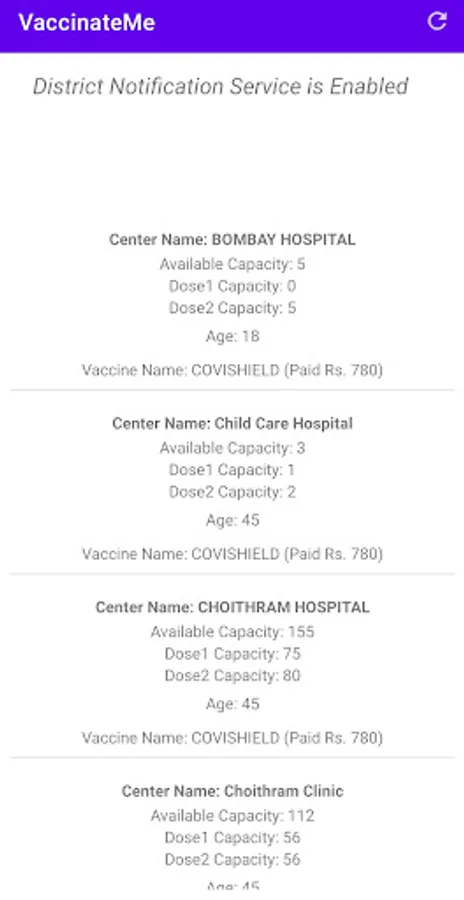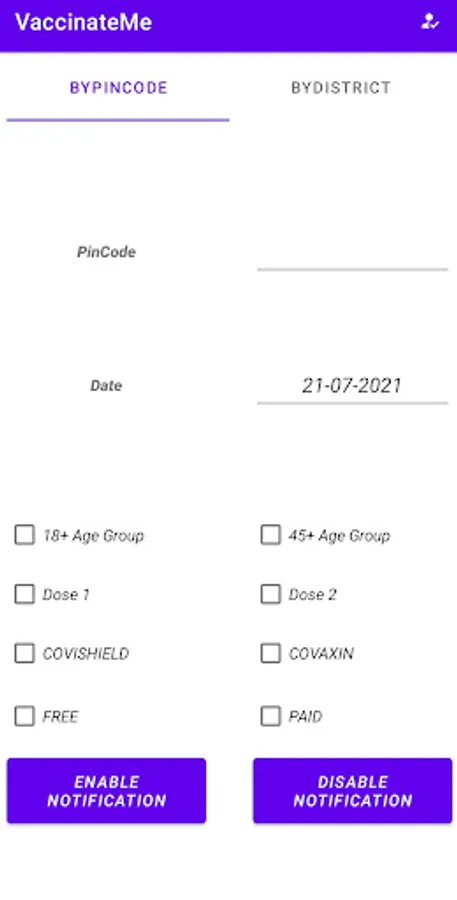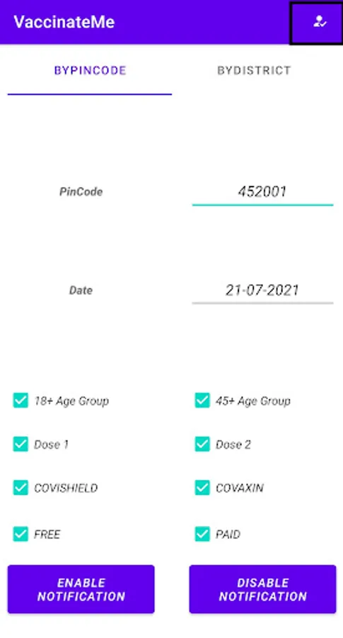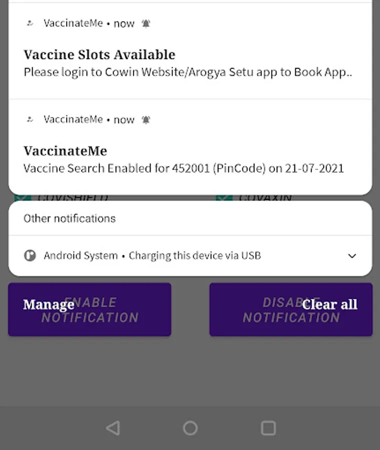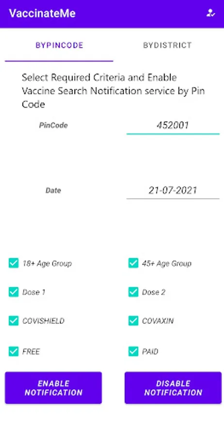 This Application can be used to enable Vaccine Notification which can be searched either via Pincode or by District Name.