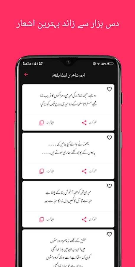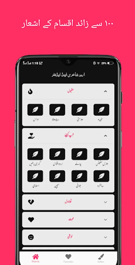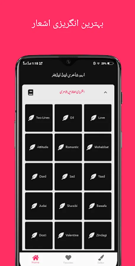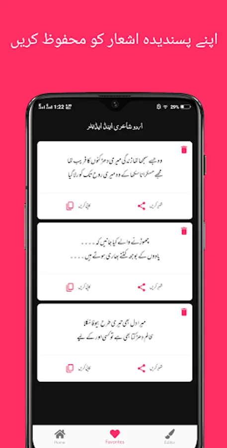 It contains best collections of Romantic Urdu Poetry, Barish Urdu Poetry, Sad Urdu Poetry, Urdu Ghazals, Emotional Urdu Poetry, Famous Urdu Poetry, Fathers Day Poetry, Mothers Day Poetry, Islamic Poetry, Pakistan Day Poetry , Offline Urdu Poetry, Urdu Shayari this Urdu Shayari & Editor app contains every type of Urdu Poetry and Urdu Shayari.