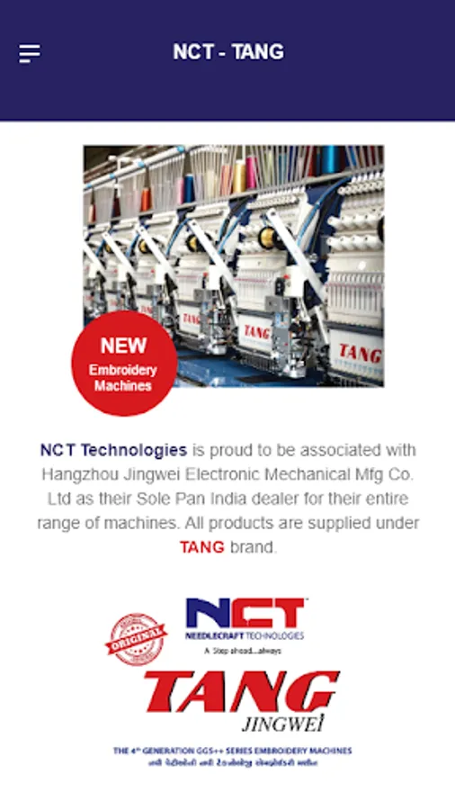 NCT Technologies is proud to be associated with Hangzhou Jingwei Electronic Mechanical Mfg Co. Ltd as their Sole Pan India dealer for their entire range of machines. All products are supplied under TANG brand.