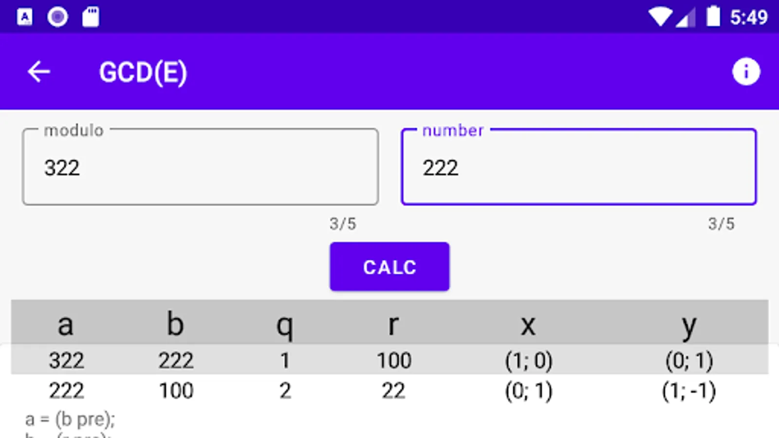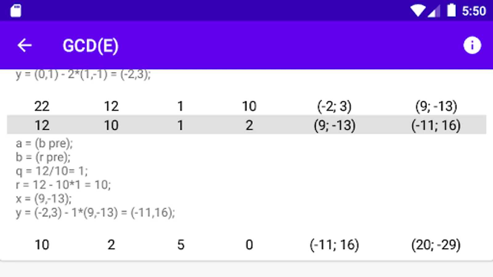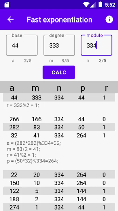 In the GCDE, fast exponentiation, and multiplicative group algorithms, the result is provided in tabular form, and each element of the table can be clicked to get a detailed calculation result.